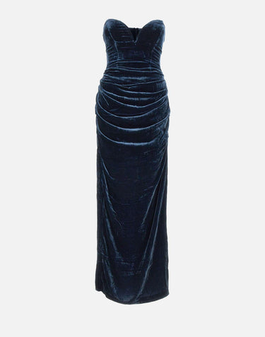 Abito Rotate Birger Christensen modello "Silk Velvet Slit Dress", realizzato in raffinato velluto blu. Il design femminile e sensuale è caratterizzato da una silhouette aderente con drappeggi eleganti, profondo spacco laterale e coppe preformate che sostengono il seno. La chiusura con zip posteriore completa il capo, perfetto per serate speciali e occasioni esclusive. Vestibilità slim.