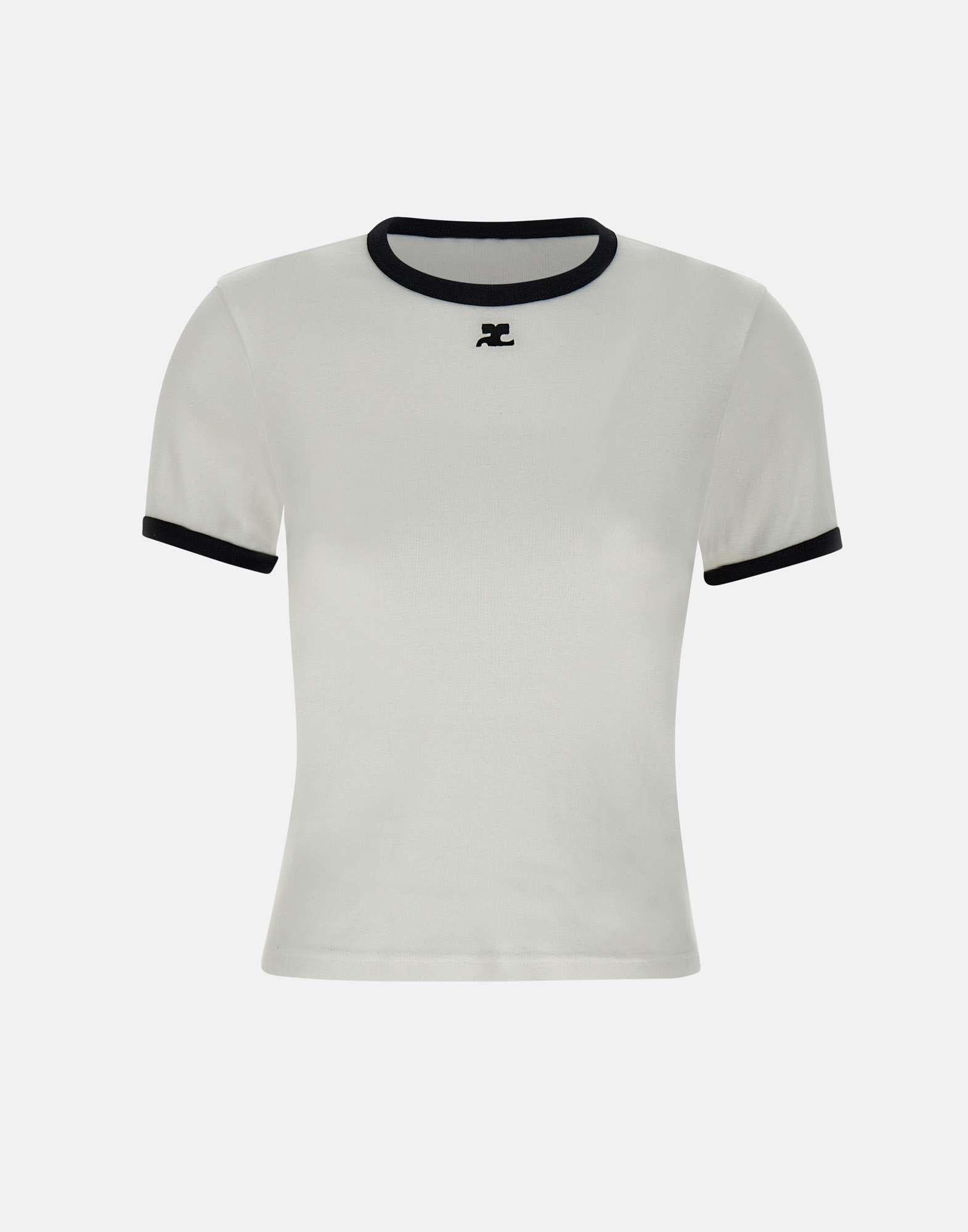 T-shirt "Signature contrast" donna Courrèges in cotone, bianca con profili a contrasto colore nero, maniche corte, girocollo con logo AC sottostante a ricamo, regular fit.