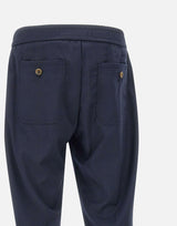 Pantaloni Myths uomo "Ade", colore blu, in tessuto misto lana stretch, Research Attitude Cordura Combat Wool Collection, tessuto traspirante e durevole, confortevole al tatto e all'indosso, chiusura con bottone e zip, vita elasticata regolare con passanti per cintura, tasche laterali a filetto, tasche sul retro con bottone, tagli sartoriali sulle gambe, fondo 21cm, slim fit. Made in Italy