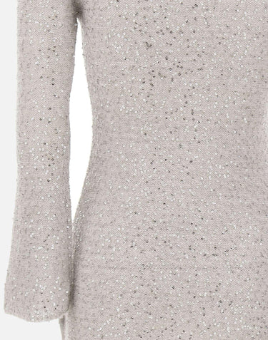 Abito Marella "Arles" in misto lana e alpaca, impreziosito da paillettes argento su tutta la superficie per un effetto luminoso e sofisticato. Presenta maniche lunghe, scollo tondo e polsini ampi. La vestibilità regular assicura comfort ed eleganza, perfetto per occasioni speciali e look da sera.