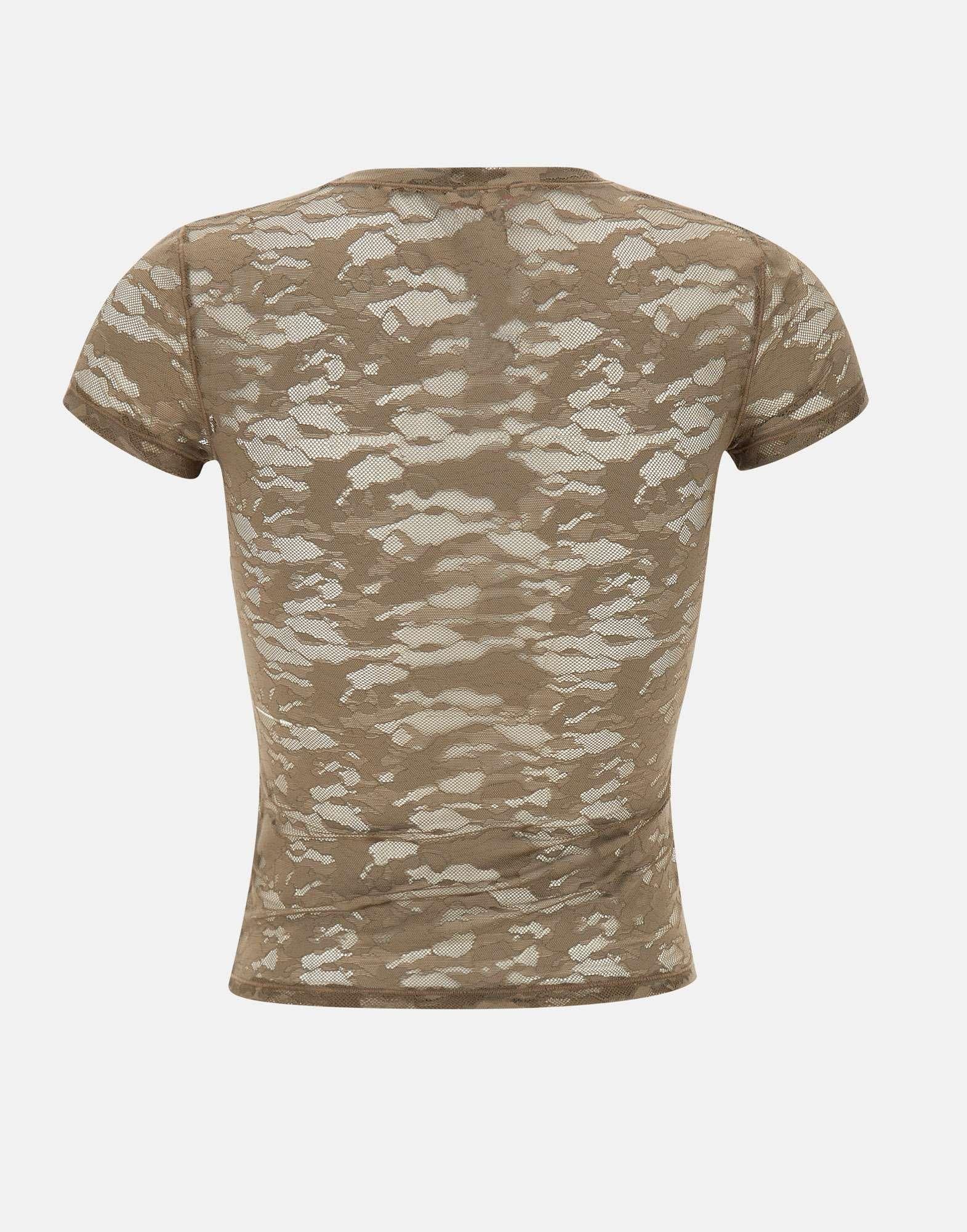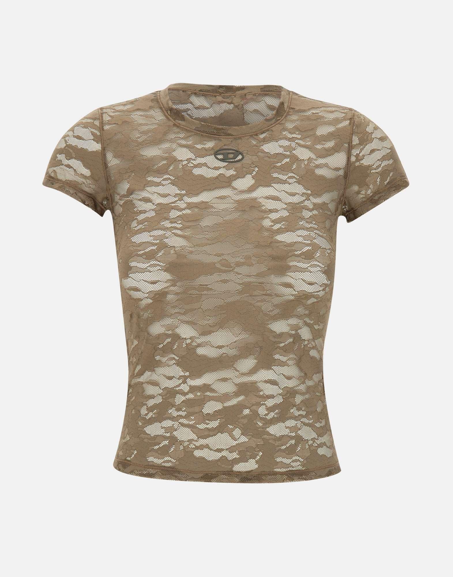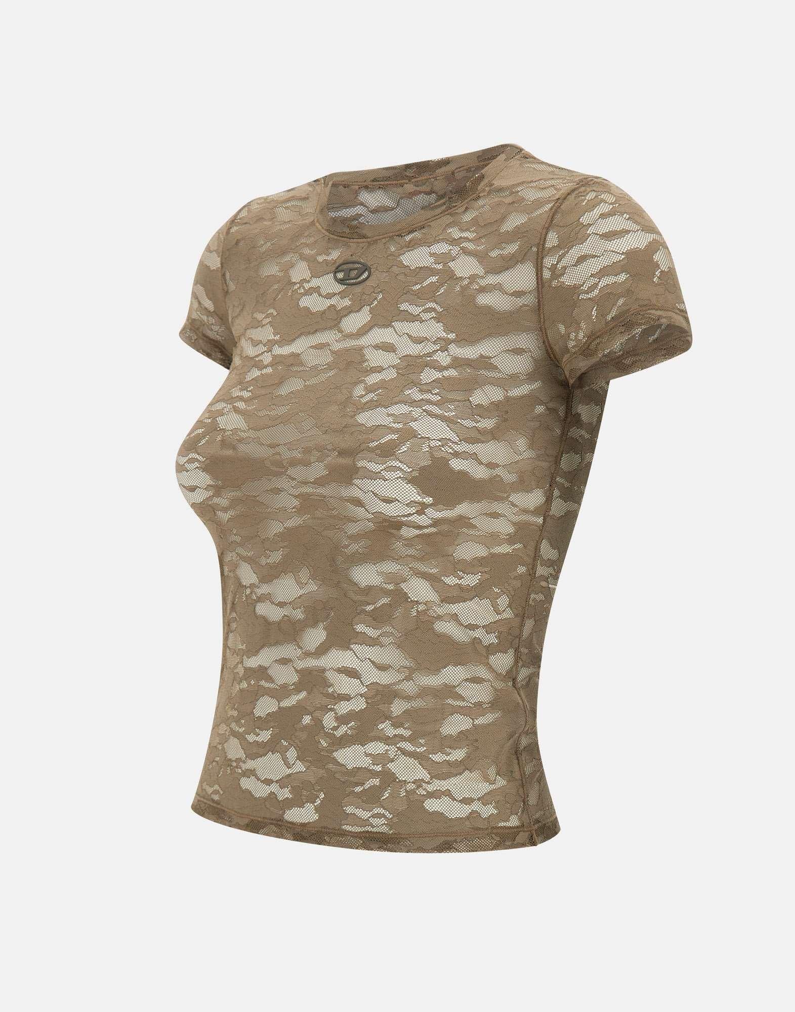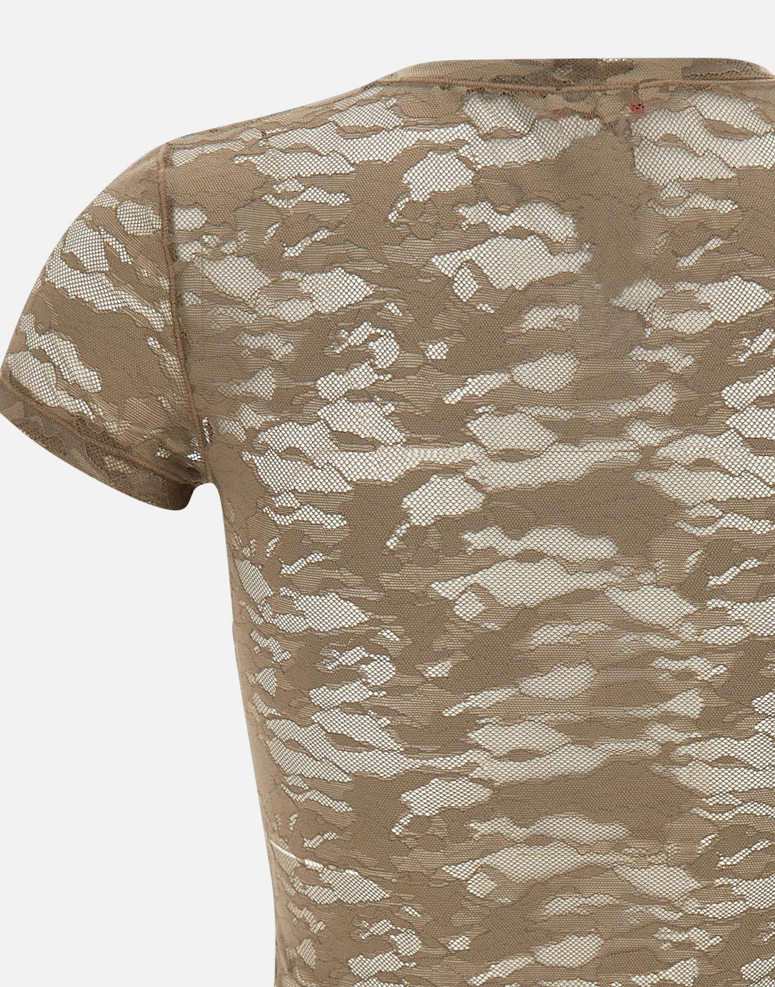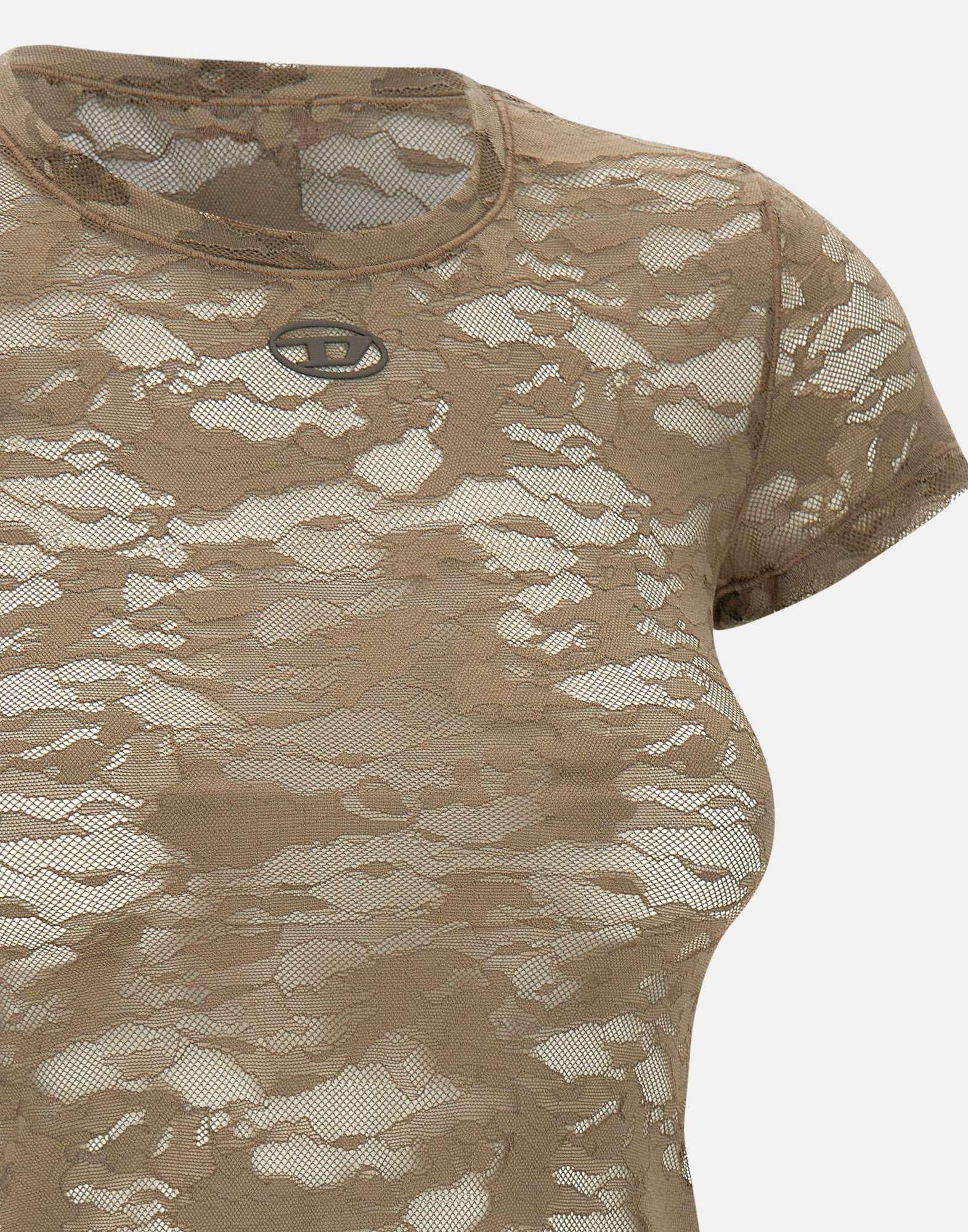 "Kasia-utlt" Diesel, color tortora, in morbido pizzo stretch su motivo mimetico e ispirazione utility, logo oval D, manica corta ad aletta, girocollo, regular fit