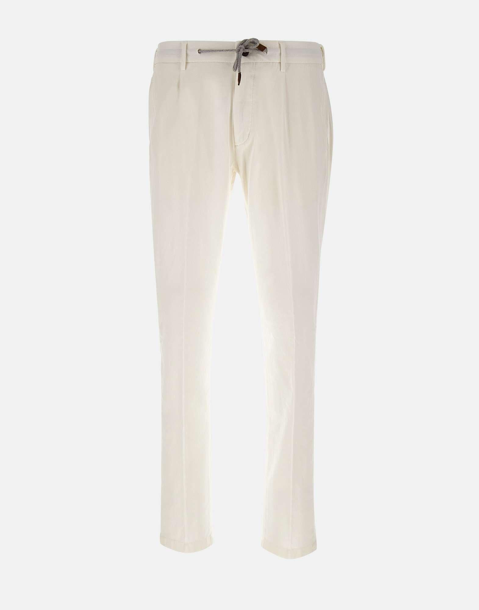 Pantaloni Iconic uomo Eleventy, modello jogger, color latte, in fresco lana, vita elasticata con coulisse e finalini in suede, passanti per cintura, chiusura con zip e bottone, tasche posteriori con pattina e bottone, tasche laterali a filetto, gamba dritta con fondo 18cm, regular fit. Made in Italy