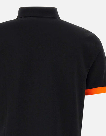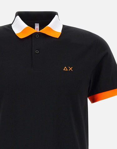 "Polo fluo multicolor" Sun68 uomo, colore nero e profili arancio fluo, maniche corte, tessuto in piquet cotone stretch, colletto classico multicolor chiuso da bottoni logati, logo a ricamo sul petto, mini spacchetti al fondo, bordi a costine, regular fit.