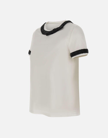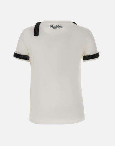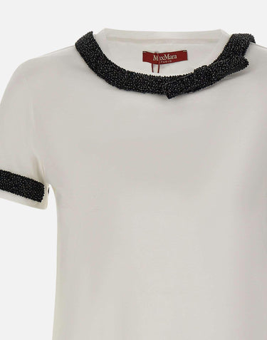 T-shirt Max Mara Studio "Pontile" in cotone, colore bianco, maniche corte, scollo tondo, dettagli gioiello a contrasto di colore, regular fit