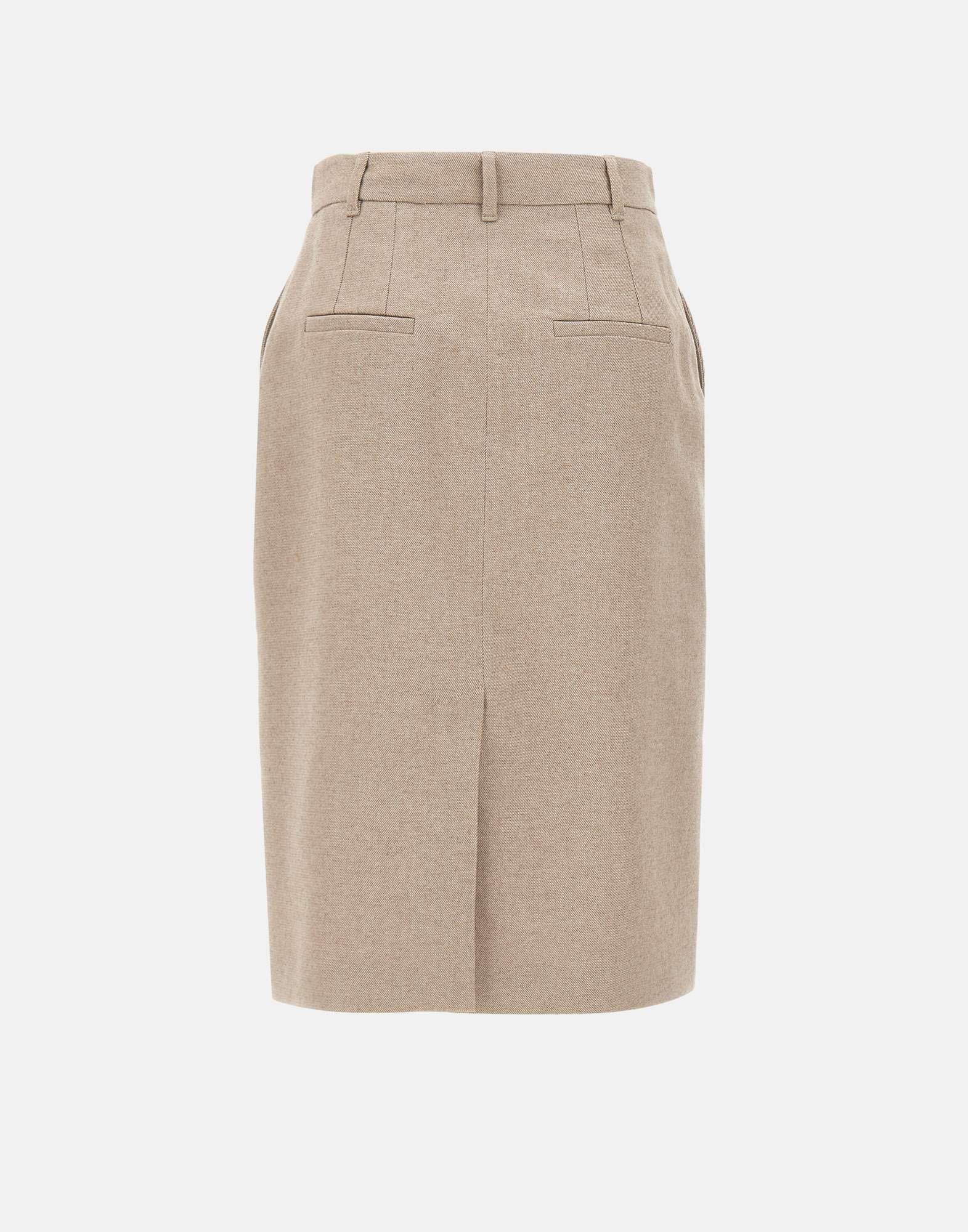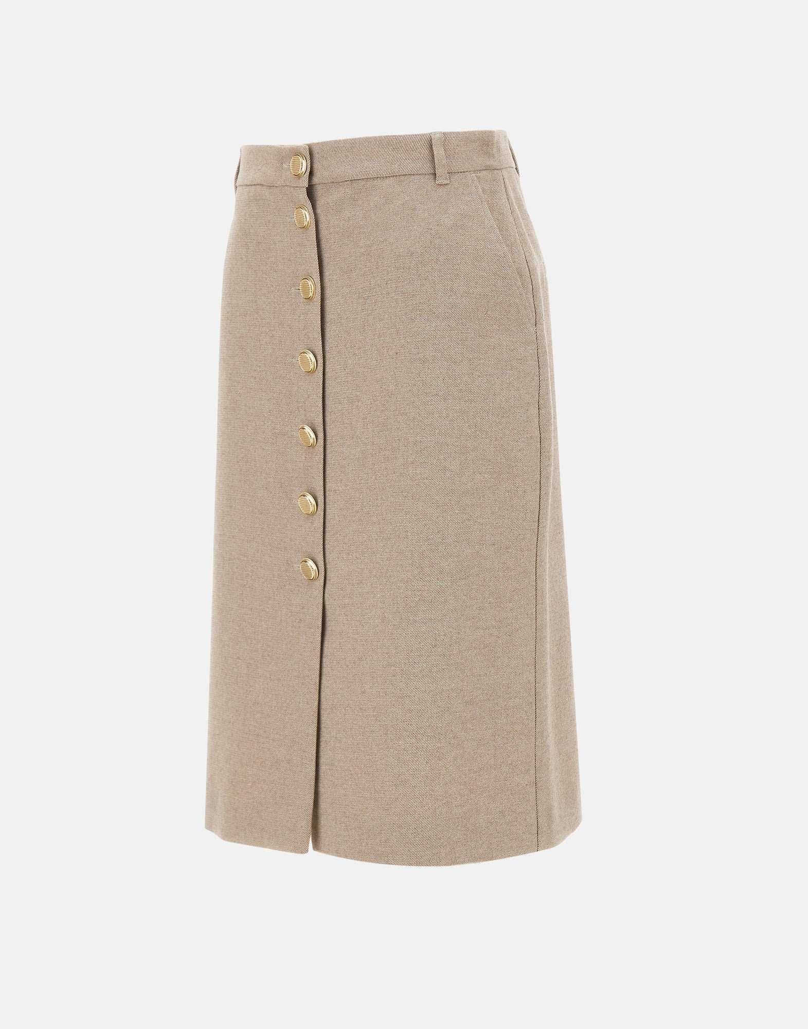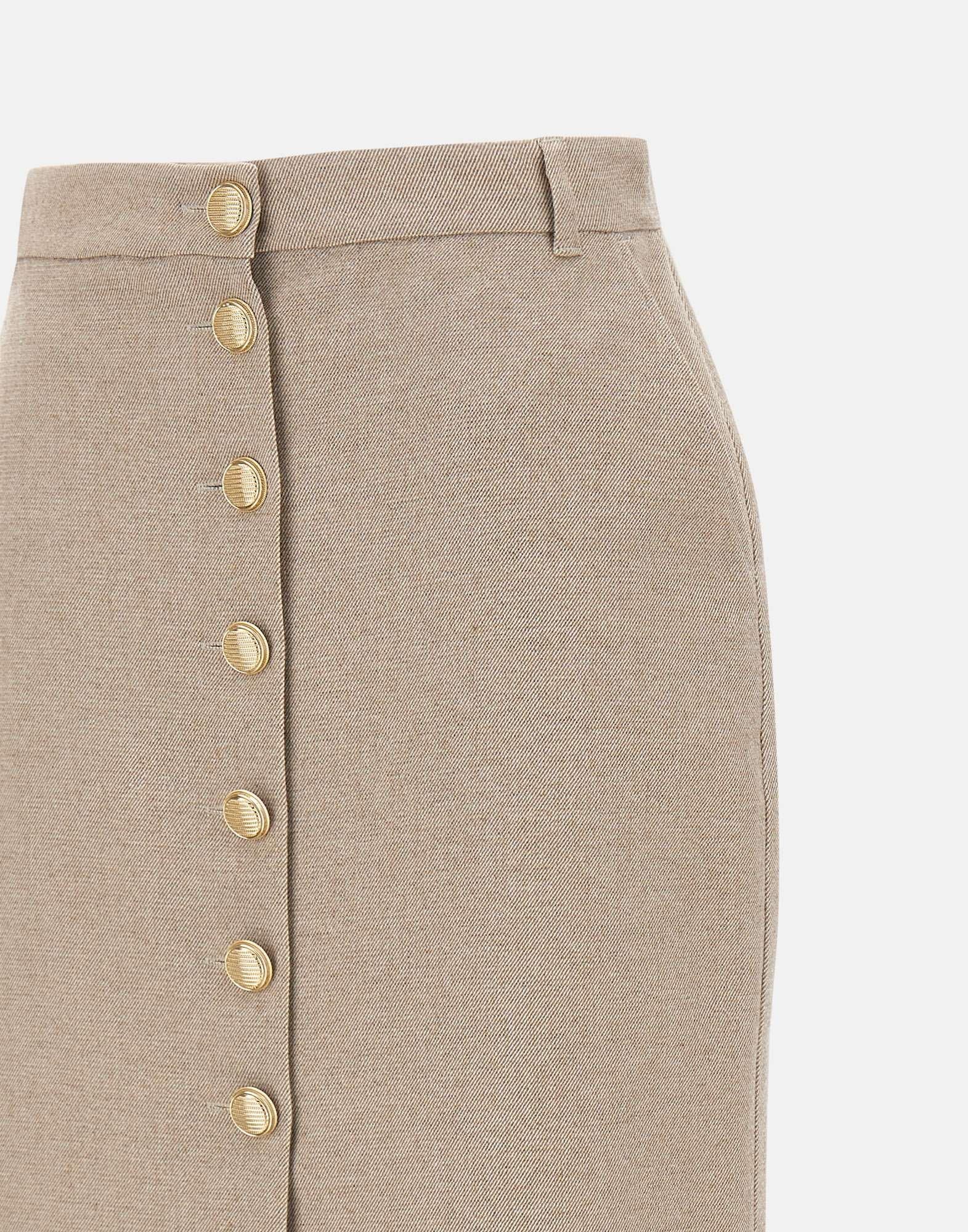 Gonna Marella "Sigaro" realizzata in tessuto misto cotone, lana e viscosa stretch, proposta in tonalità greige. Caratterizzata da chiusura frontale con bottoni dorati gioiello, tasche laterali alla francese, passanti per cintura e tasche posteriori. La linea dritta e la vestibilità regular la rendono un capo versatile ed elegante, perfetto per look da giorno o da ufficio.fit