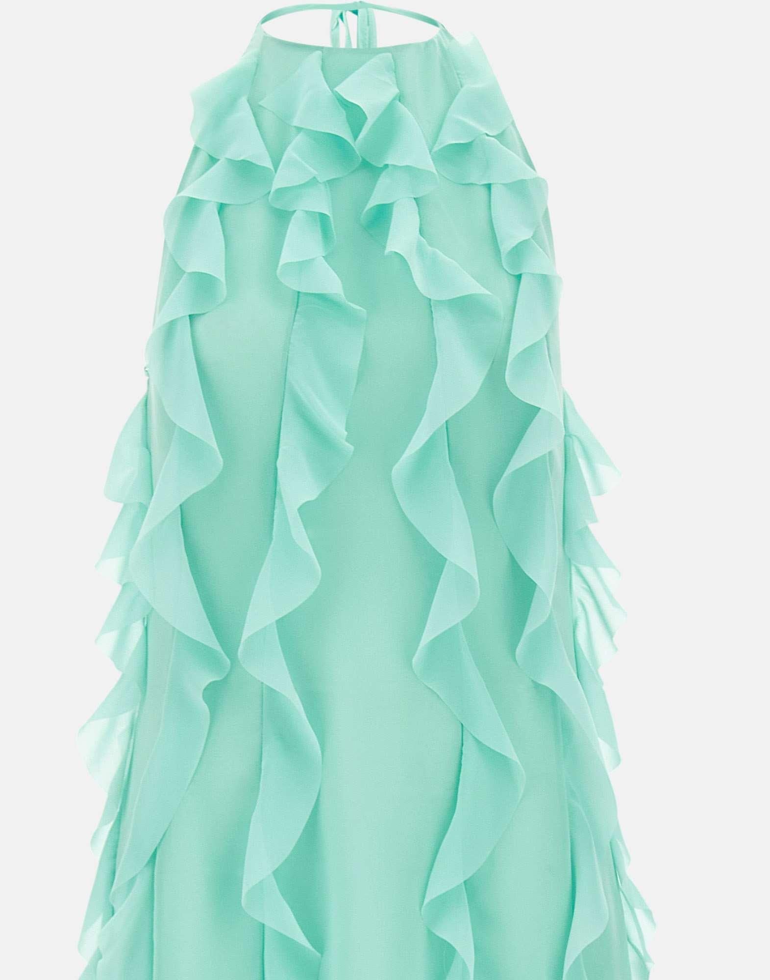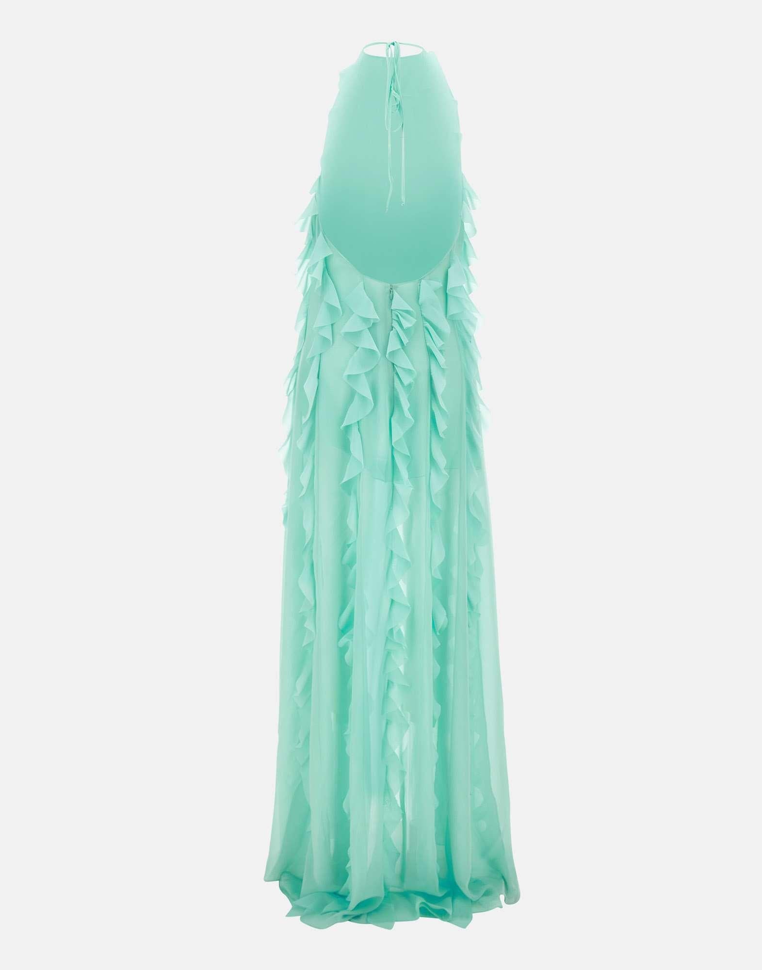 Abito Les Filles D'Eva, verde acqua, in georgette, smanicato, scollo all'americana, lungo, chiusura con gancetto e zip sul retro, rouches su tutta la superficie, linea scivolata, super femminile, apertura sul davanti, silhouette aderente, regular fit, made in Italy