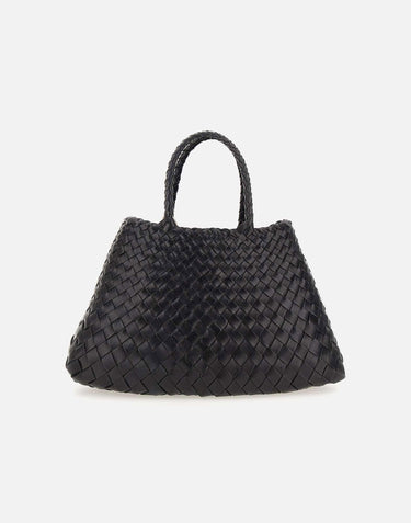 Borsa a mano Dragon Diffusion "Santa Croce Small" in pelle nera, intrecciata interamente a mano secondo liconica tecnica artigianale del brand. Modello sfoderato, con doppio manico superiore (16,5 cm) per una portabilità elegante. Allinterno è presente la caratteristica medaglietta di San Cristoforo, simbolo di protezione per i viaggiatori. Inclusa dustbag in tessuto. Dimensioni: larghezza inferiore 38 cm, larghezza superiore 17 cm, altezza 20 cm