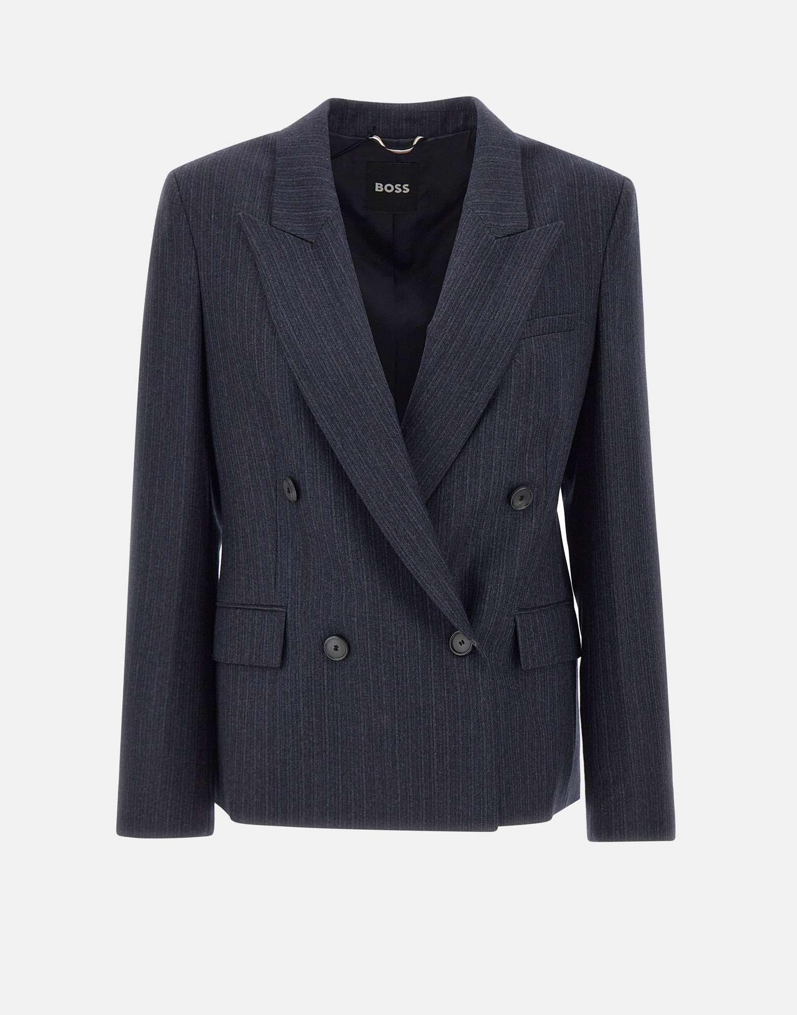 Blazer donna Boss "Jaleto9" in pregiata lana Marzotto, dal taglio svasato e dalla linea elegante. Rever a lancia, chiusura doppiopetto con bottoni in tinta e taschine applicate con patta sul davanti. Taschino per pochette, polsini con bottoni e spalline imbottite per una struttura impeccabile. Completamente foderato per un comfort superiore. Vestibilità regular, ideale per look professionali e sofisticati.