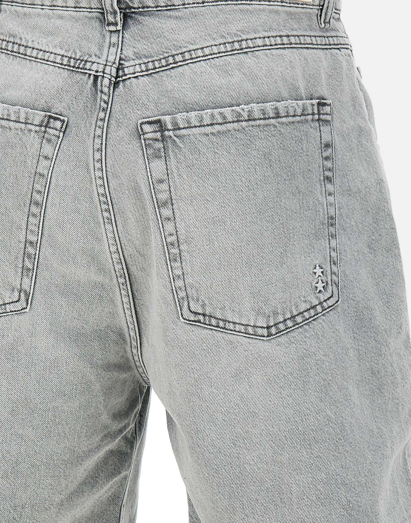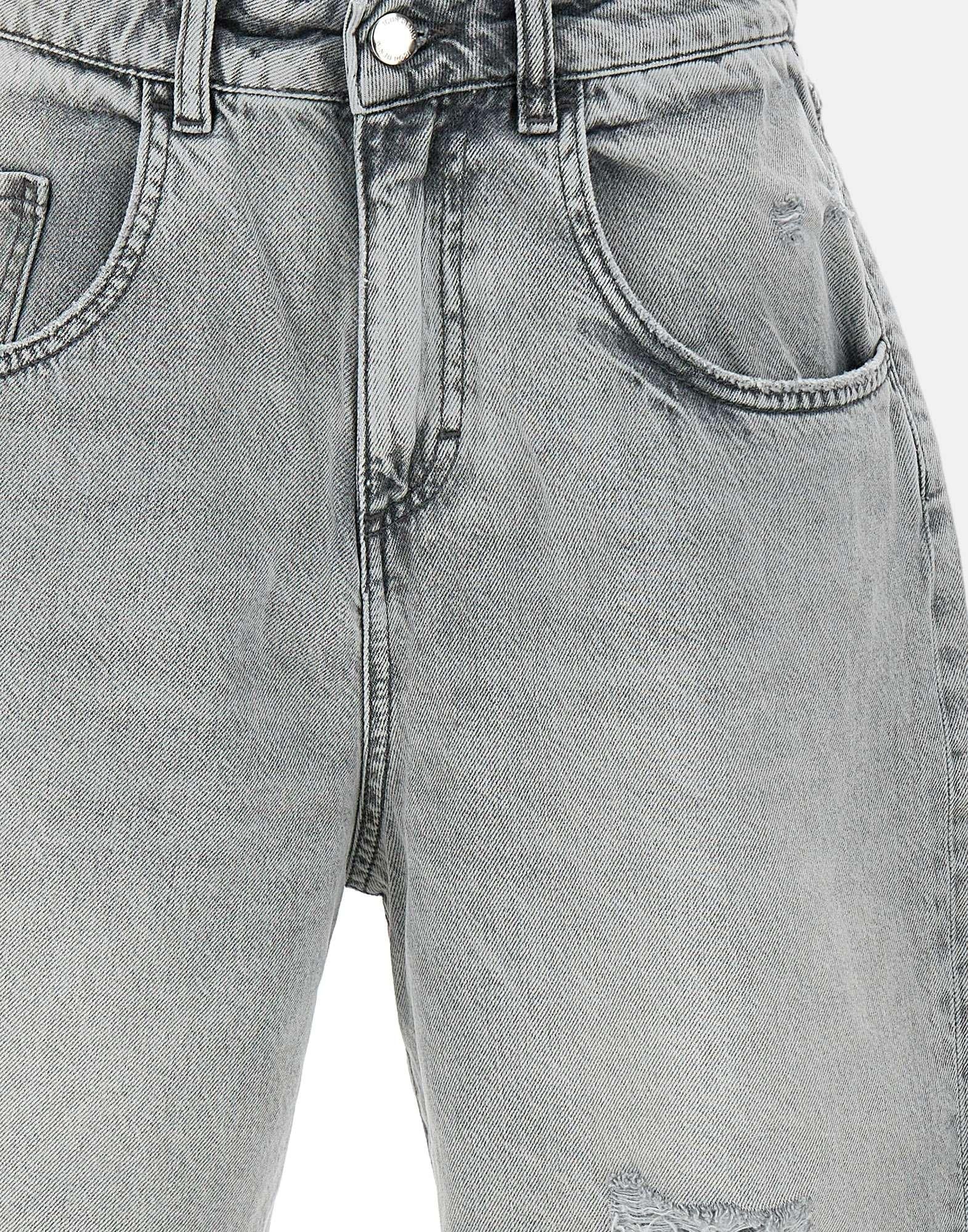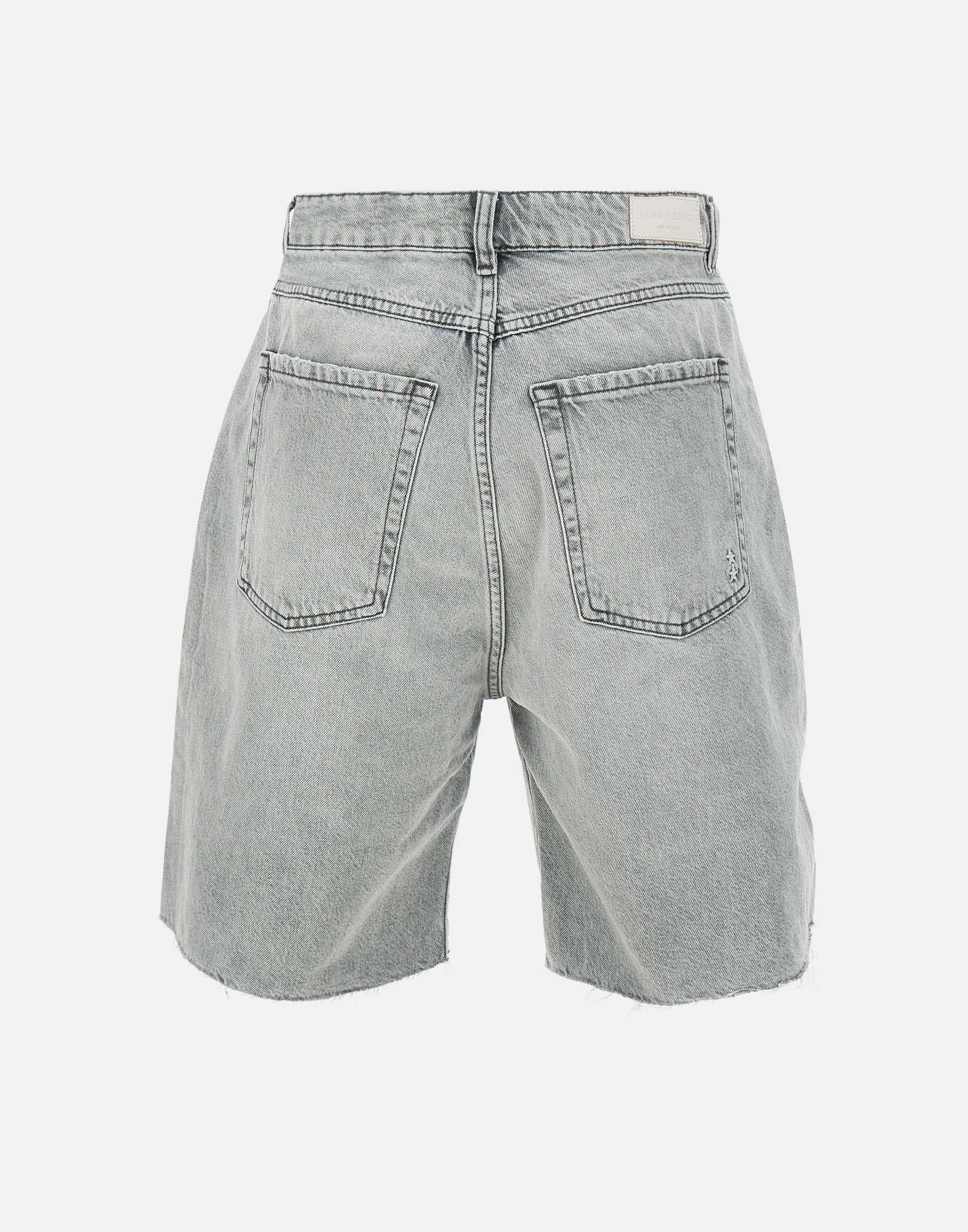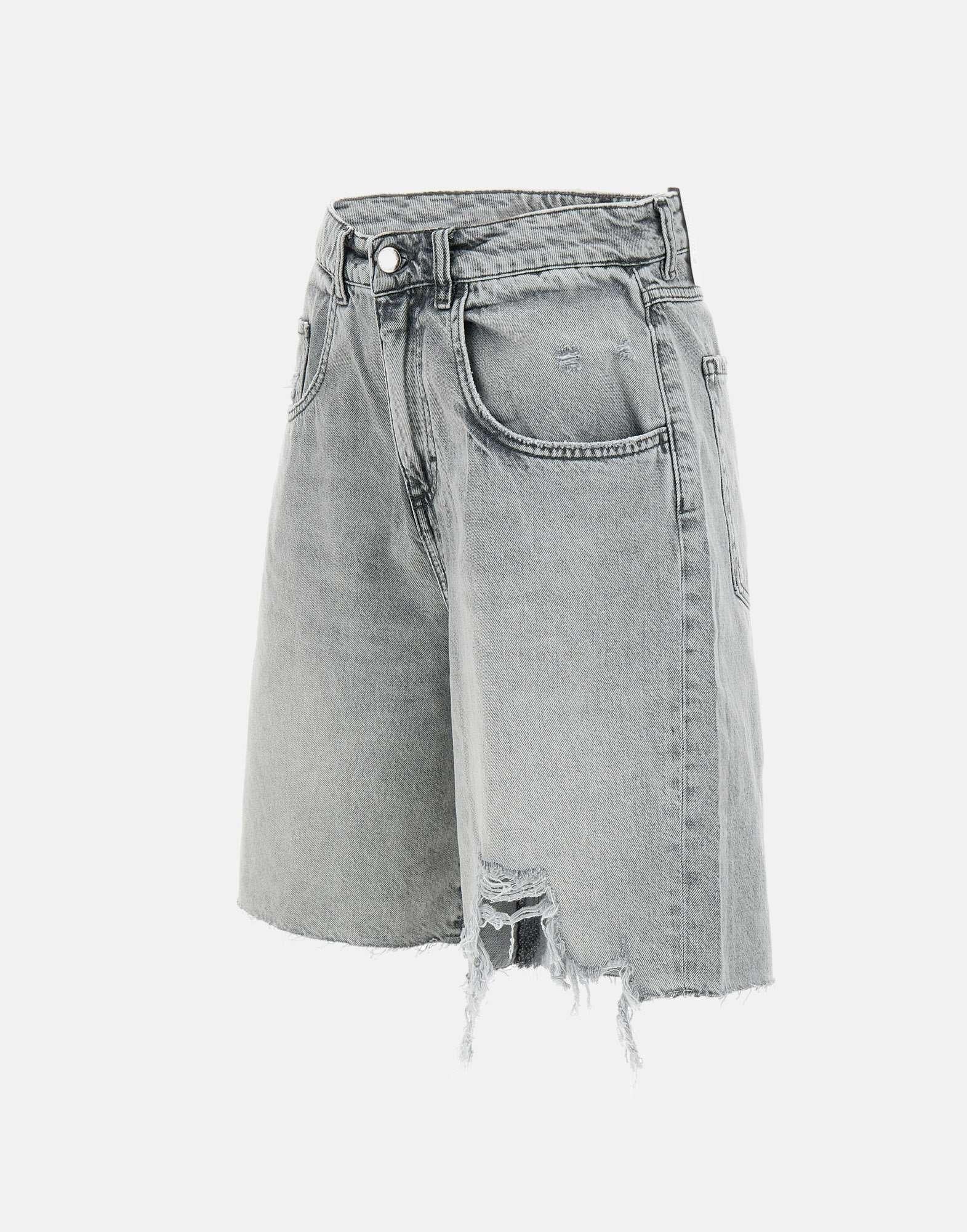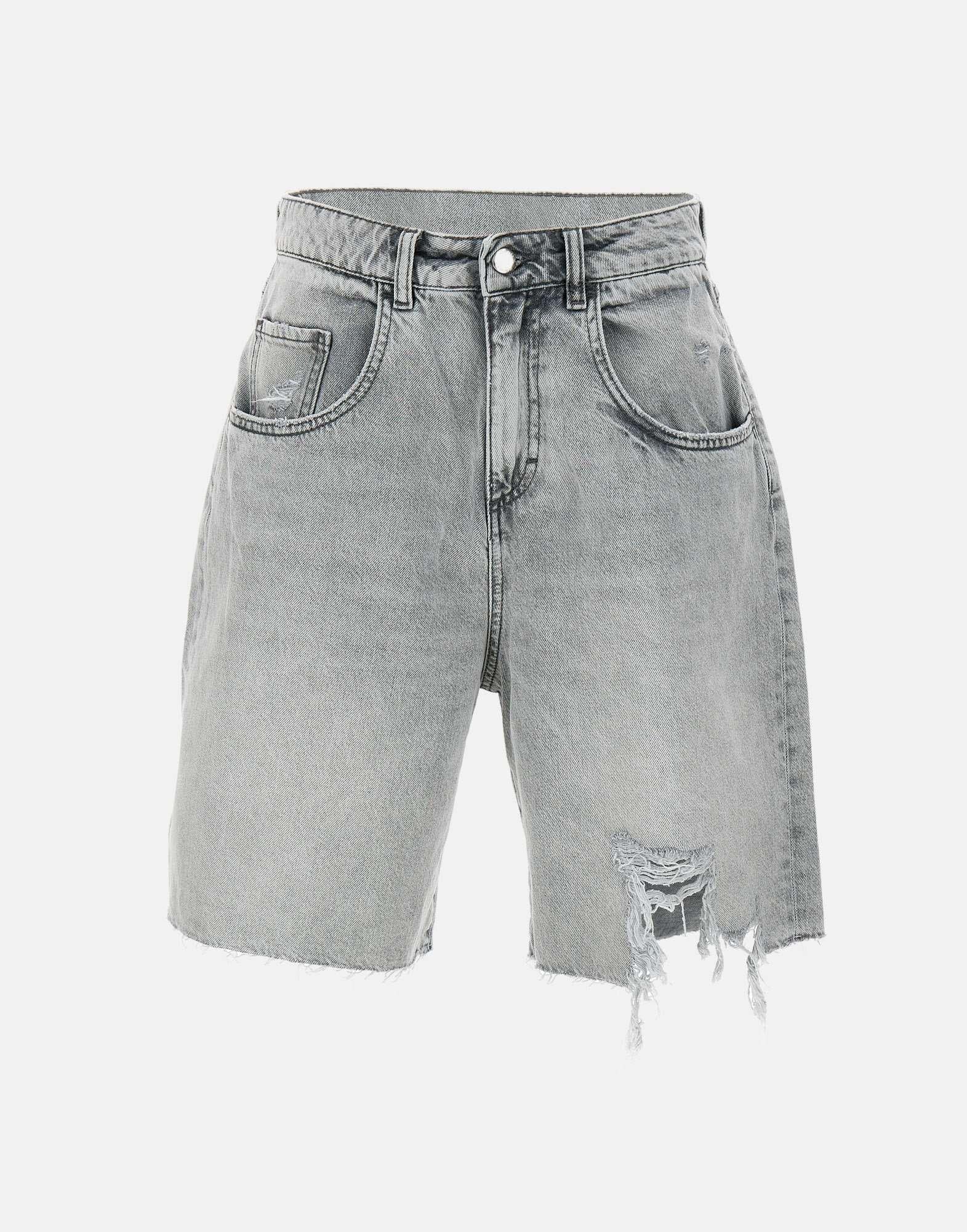 Shorts donna Icon Denim "Lea" in denim di cotone, nero trattamento stone washed, chiusura con bottone logato e zip, modello cinque tasche, dettagli destroyed, patch logo in pelle sul retro, vita alta con passanti per cintura, bordi sfrangiati, regular fit.