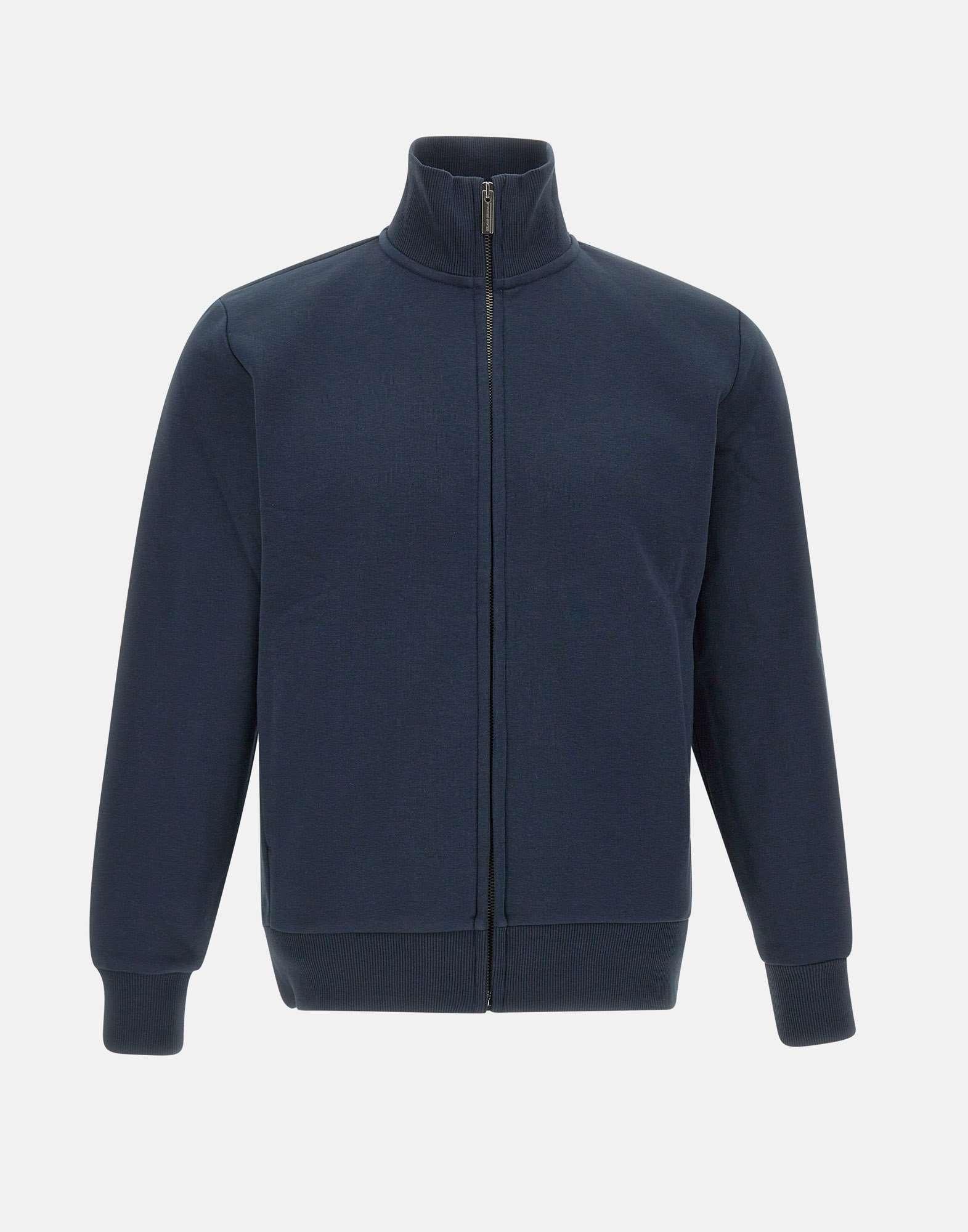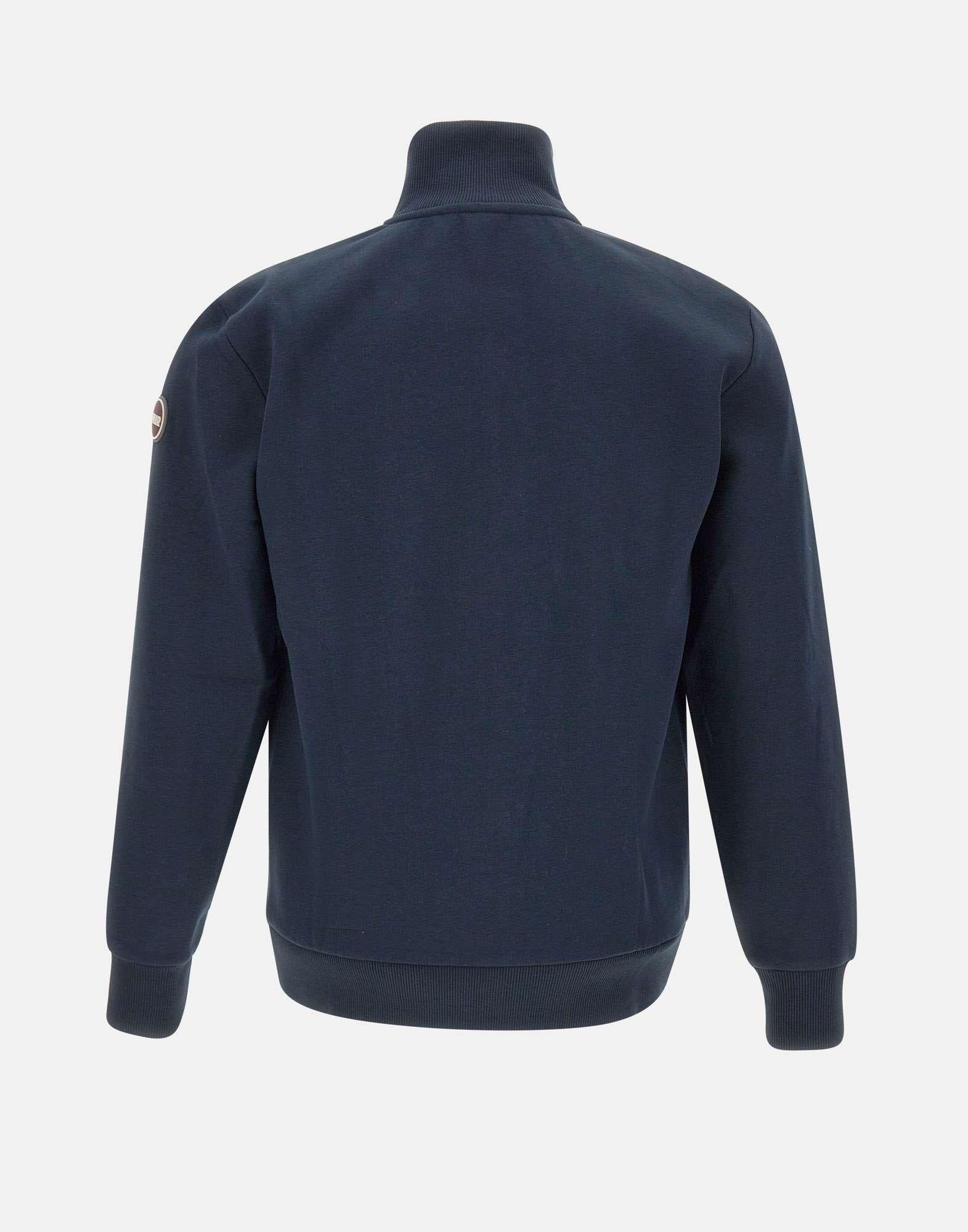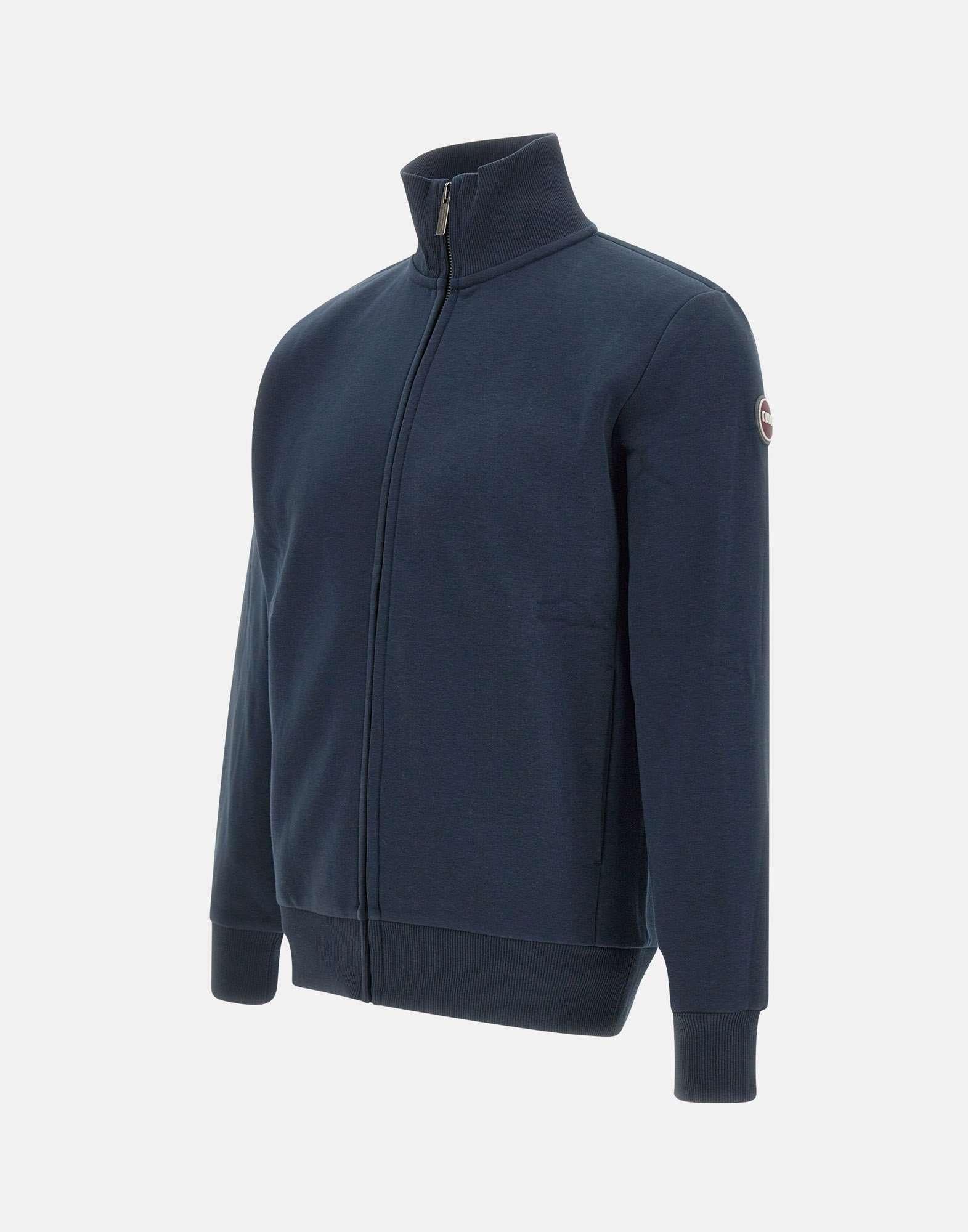 Felpa uomo Colmar Originals in misto cotone, colore blu navy, con interno felpato per un comfort termico ottimale. Presenta chiusura frontale con zip, patch logo applicato sulla manica e finiture a costine su collo, polsini e fondo per una vestibilità aderente e rifinita.