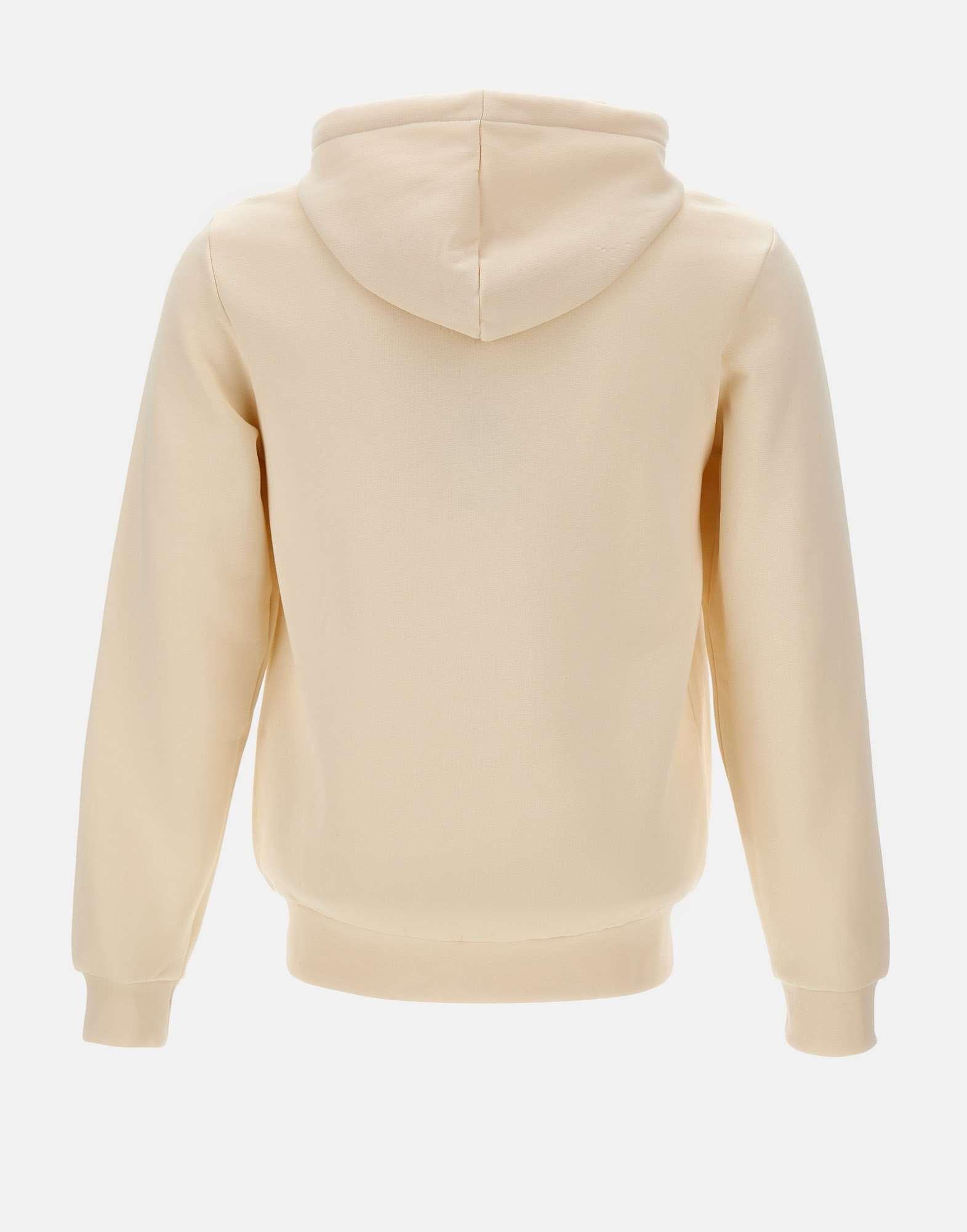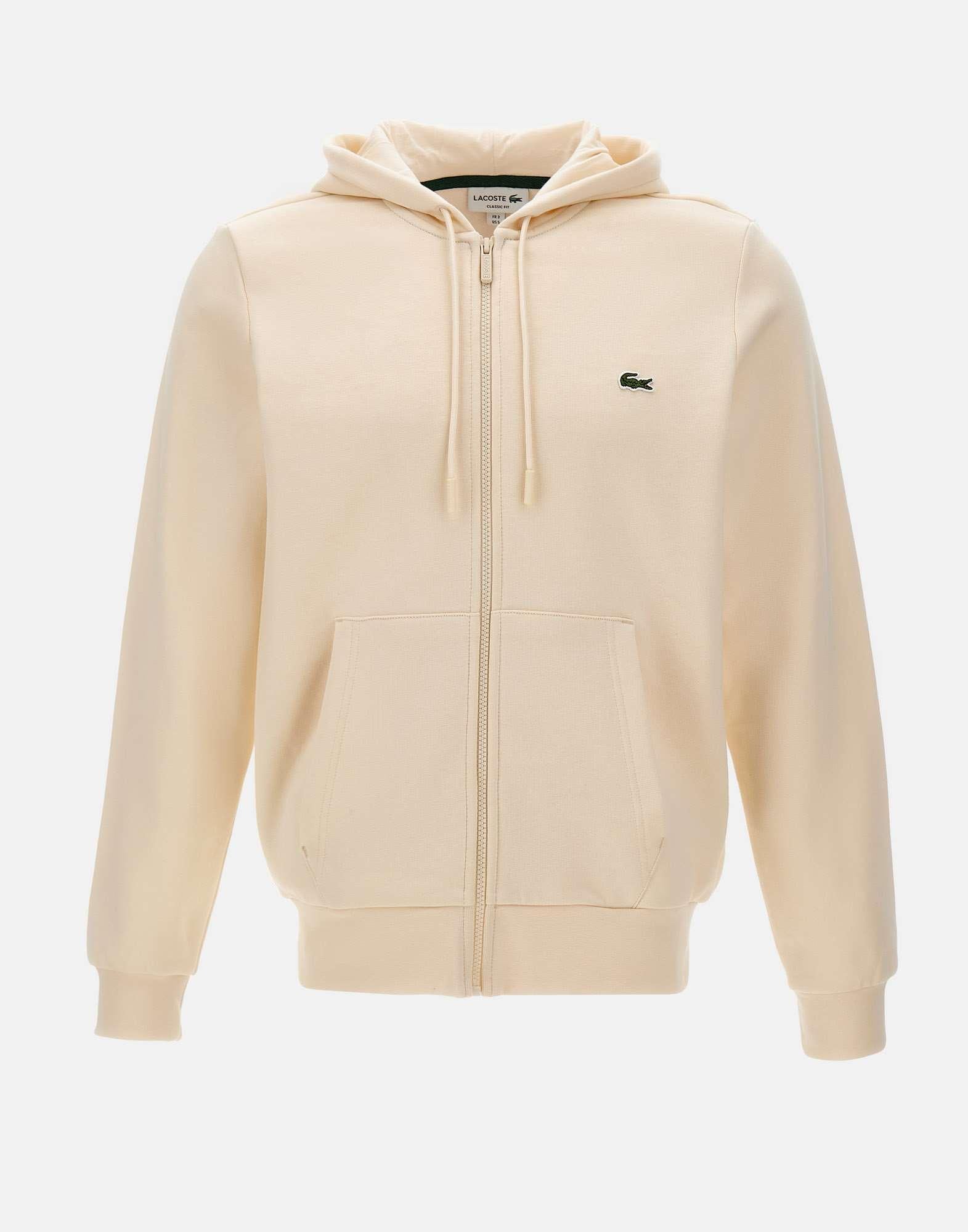 Felpa uomo Lacoste in misto cotone organico, crema, cappuccio con coulisse in tinta, chiusura frontale con zip logata, patch logo iconica Coccodrillo sul petto, tasche laterali a fessura, interno felpato. Classic fit