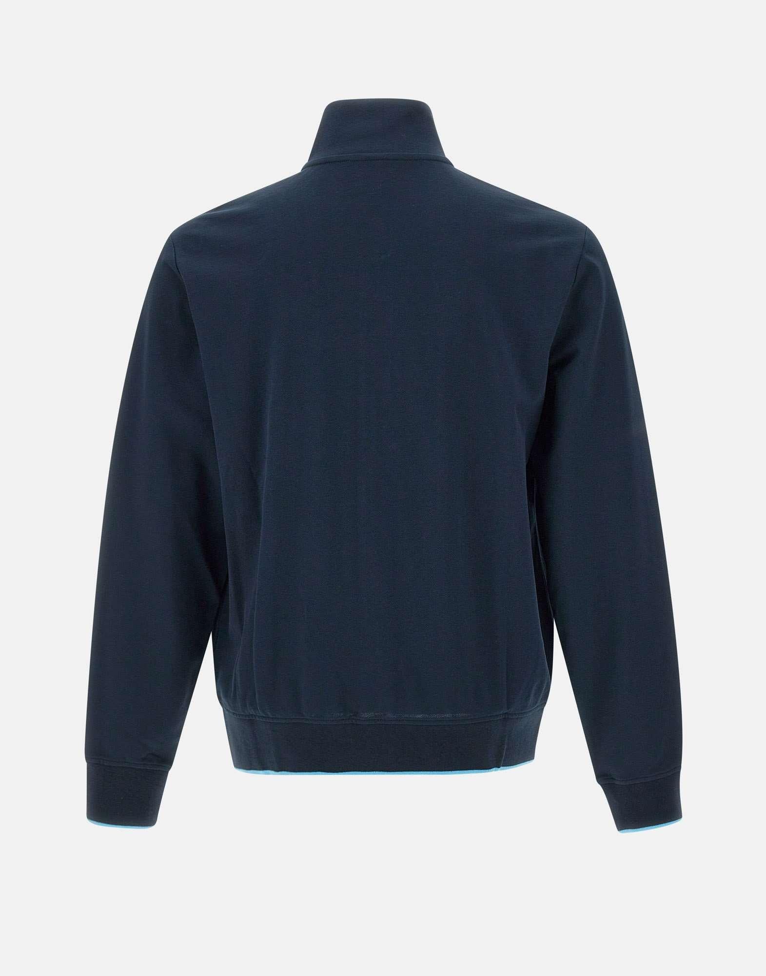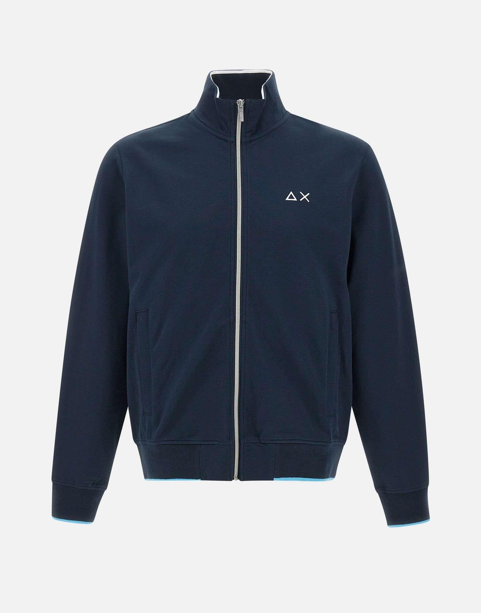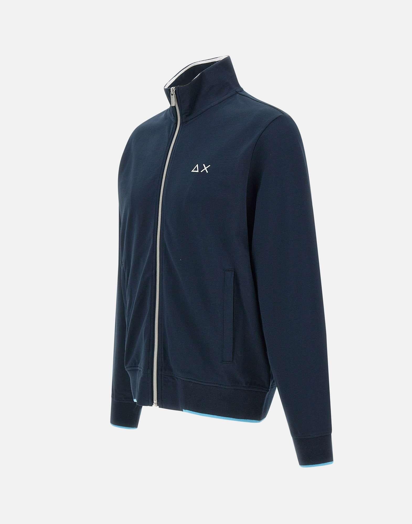 "Track zip piquet polo stripes" uomo Sun68, blu, maniche lunghe, colletto in piedi, profili a contrasto di colore, bordi a coste, tasche laterali con zip, chiusura full zip, interno non felpato, logioa ricamo sul petto, regular fit