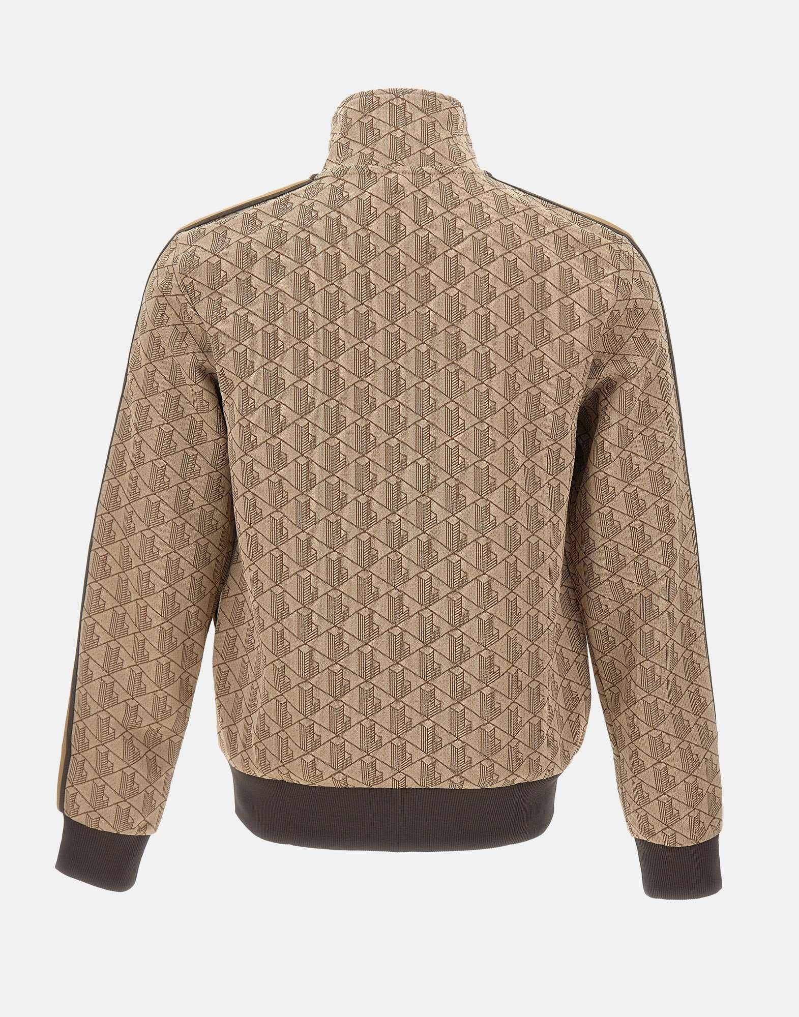 Felpa uomo con zip Paris, dal design audace ispirato alle tute anni '70. Realizzata in pregiato tessuto jacquard di cotone organico e poliestere nei toni del marrone e beige, presenta monogramma all-over e righe a contrasto sulle maniche. Il modello con chiusura full zip è completato da tasche a filetto, maniche lunghe, bordi a coste e vestibilità regular leggermente aderente. Dettaglio distintivo: Coccodrillo ricamato sul petto. Lavaggio max 30°.