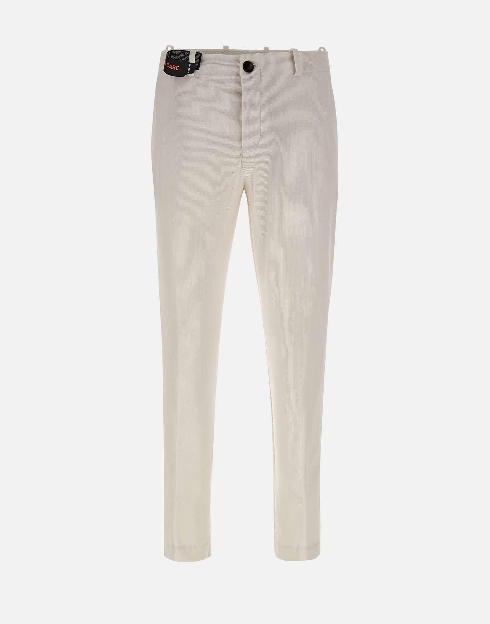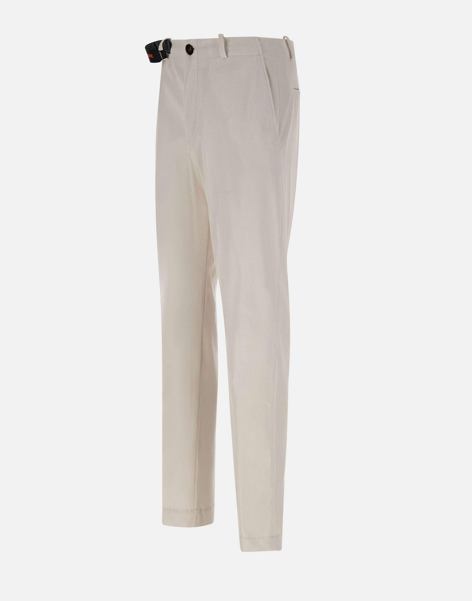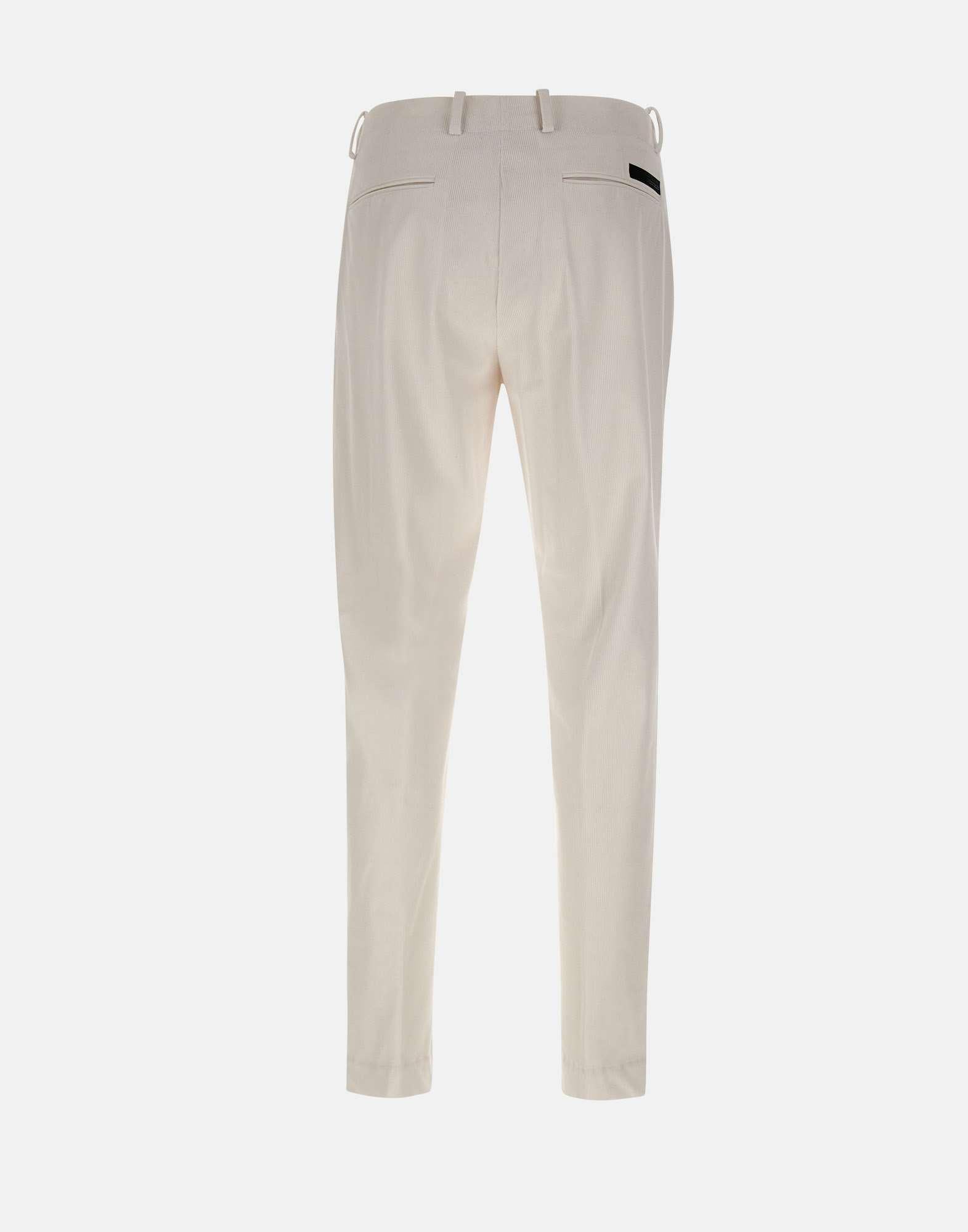 "Velvetflex 1000 Week End Pant" uomo RRD, bianco, gamba diritta con fondo 17cm, realizzati nell'esclusivo tessuto stretch SURFLEX stampato con pigmenti delavé, lavorazione floccata effetto velluto millerighe, touch particolarmente morbido, proprietà antipiega ed easy car, cintura con passanti, chiusura con bottoni nascosti, tasche laterali alla francese, posteriori a filetto, interno con stampa nell'esclusivo Monogram Razzle Dazzle, logo a microiniezione nero. Slim fit