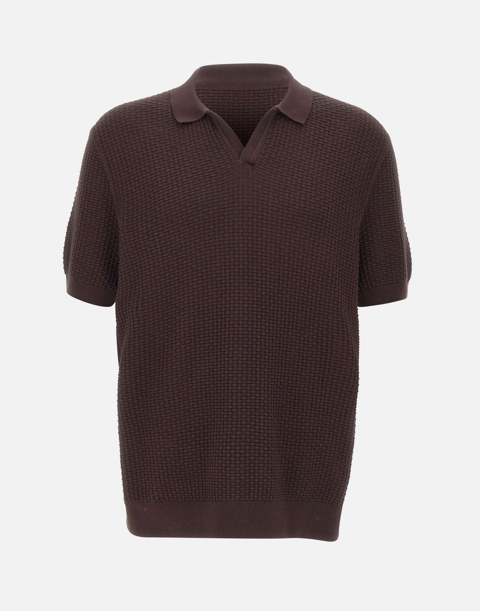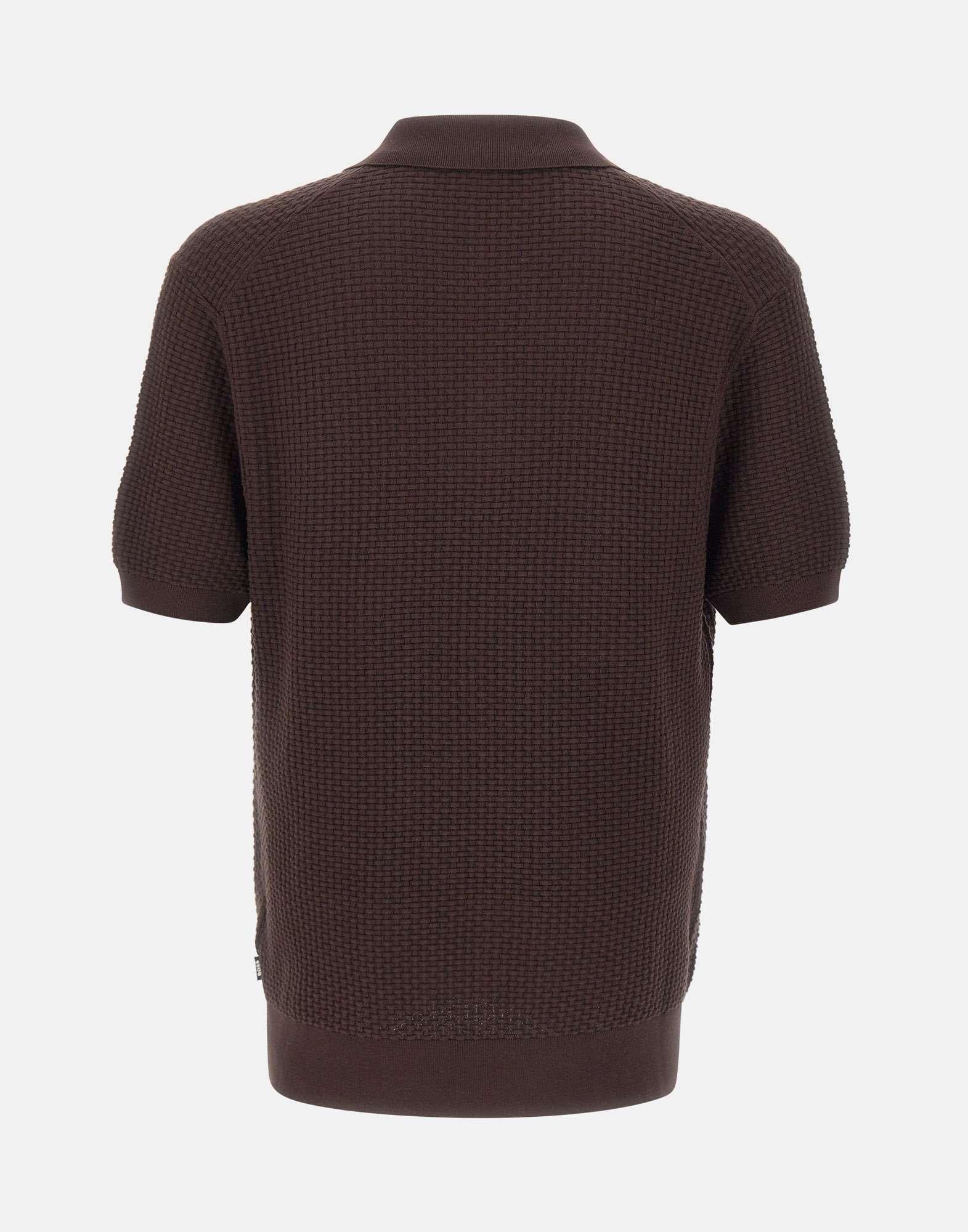 Polo uomo Boss "H-Natalo" realizzata in maglia di cotone color marrone scuro con effetto intreccio, dal gusto contemporaneo e rilassato. Il modello presenta maniche corte con orli a costine, colletto aperto in maglia piatta senza bottoni e fondo a costine, dettagli che definiscono una linea pulita ed elegante. La vestibilità rilassata assicura comfort e libertà di movimento, rendendo questa polo uomo ideale per look casual sofisticati e versatili.