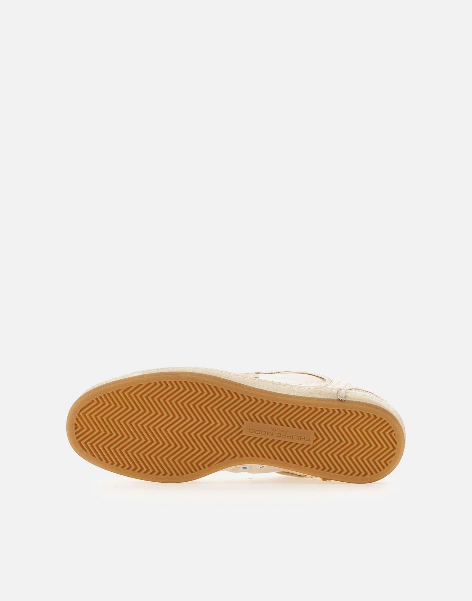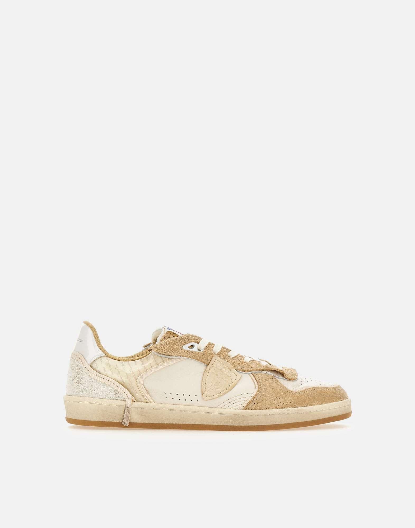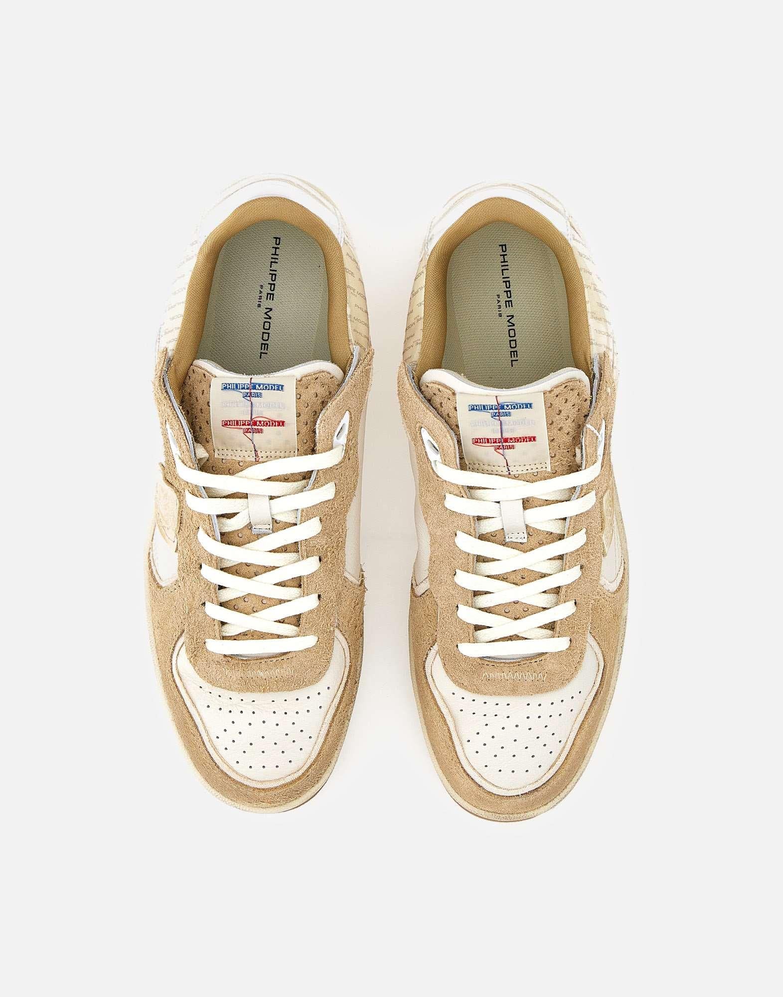 Sneakers uomo Philippe Model Paris "Pgal Low" in pelle, colore bianco e sabbia. Versione special con sporcature, doppia tomaia destrutturata, spoiler e scudo a contrasto, linguetta personalizzata come il dettaglio plastificato a lato della tomaia. Soletta interna in poliuretano espanso rivestito in pelle per massimo comfort, fodera in spugna di cotone traspirante e suola in gomma personalizzata alta 3cm. Custodia protettiva inclusa. Realizzate artigianalmente in Italia. Calzata regolare.