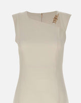 Abito donna Liu-Jo in crepe stretch, burro, modello a tubino, accessorio a catena in metallo gold frontale su girocollo con motivo cut out, spalline larghe, spacco posteriore, chiusura con zip sul retro, regular fit. Prodotto “Liu Jo Better”.