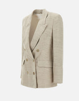 Blazer donna Marella "Alfa", beige, in lino, rever a lancia, chiusura doppiopetto con bottoni gioiello in madreperla tono su tono, polsini con bottoni, tasche anteriori con pattina, spacco centrale sul retro, relaxed fit.