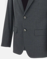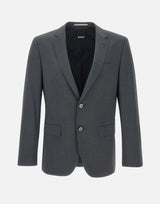 Blazer uomo "H Huge" Boss in misto lana vergine, colore grigio antracite, tessuto stretch ultratraspirante Trans Seasonal e Four Way Stretch, collo con rever a lancia, chiusura con due bottoni tono su tono, polsini con bottoni, tasche interne, taschino sul petto, tasche anteriori con pattina,foderato, spacchi laterali sul retro, slim fit.