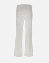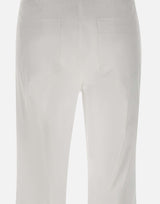 Pantaloni "Girotta" Marella, colore bianco, in fresco popeline di misto cotone stretch, linea flare, cinque tasche, chiusura con bottone logato e zip, piega stirata fronte e retro, fondo 22cm, fit regolare