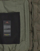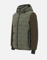 Piumino bimaterico Peuterey "Holzer Sjn Bmat" colore verde, realizzato in jacquard di poliestere stretch e drill tecnico in nylon elasticizzato con interno garzato. Appartenente alla Primaloft Collection, presenta trapuntatura a scacchi, cappuccio removibile, chiusura con zip centrale a doppio cursore, polsini antivento e tasche laterali con zip.