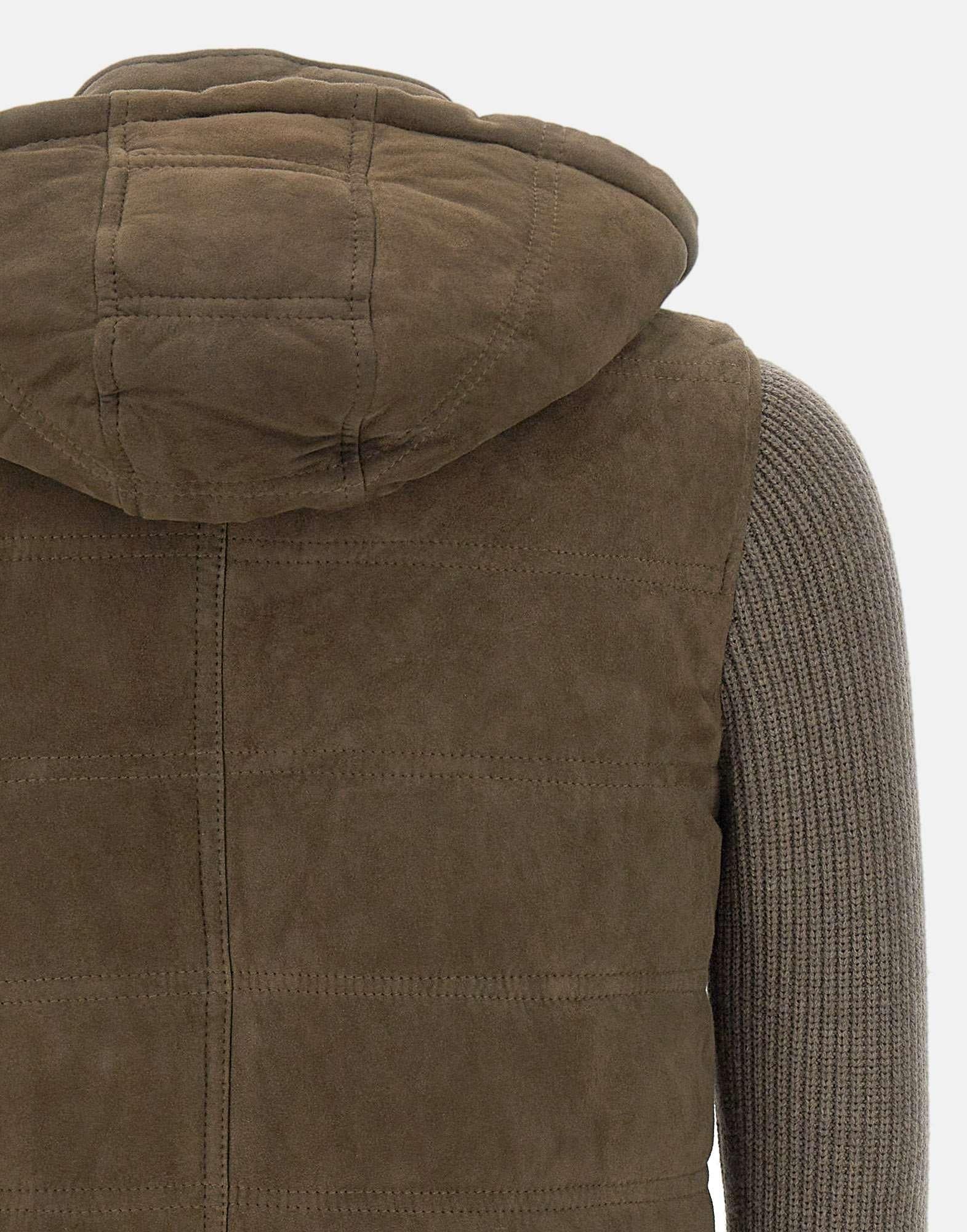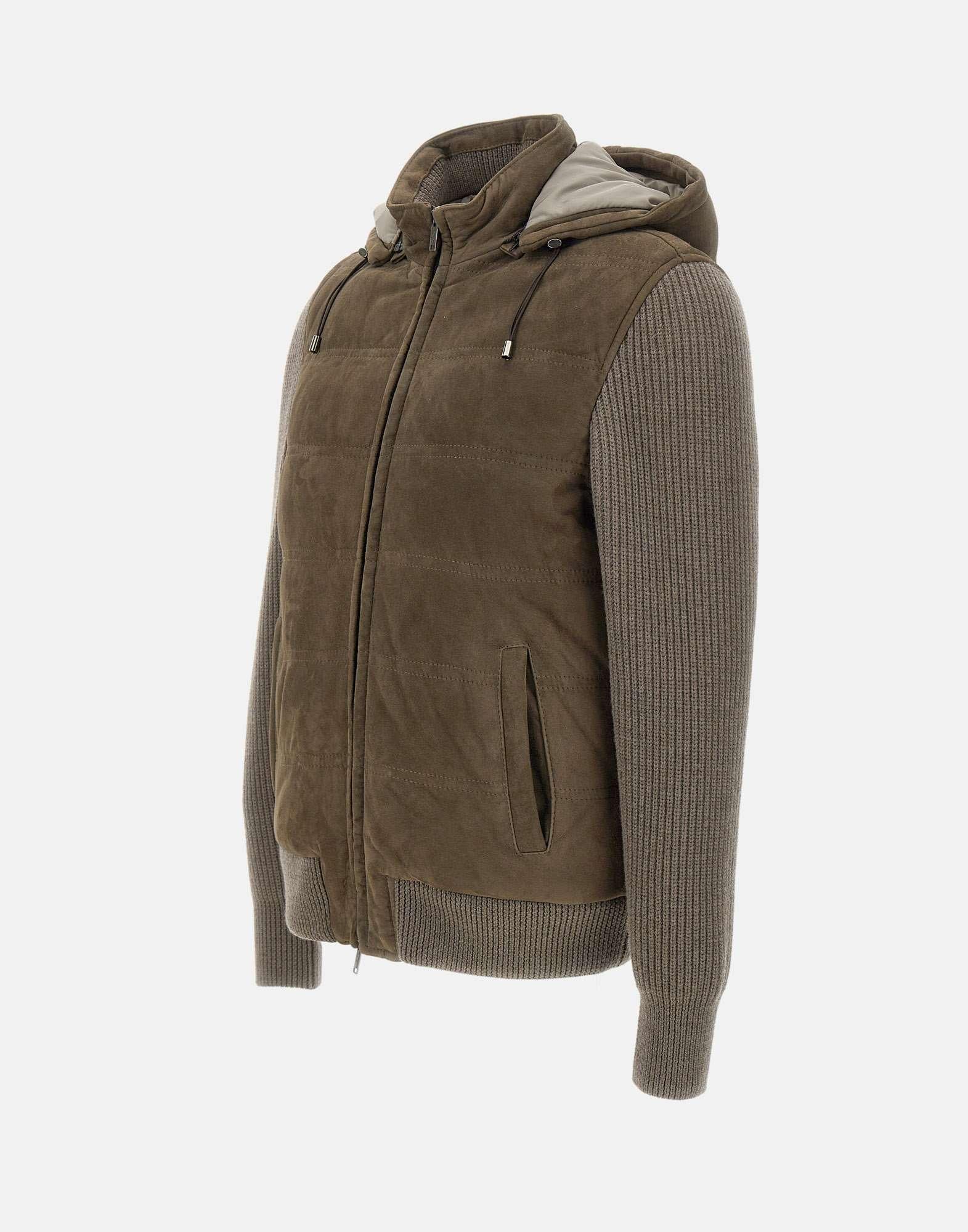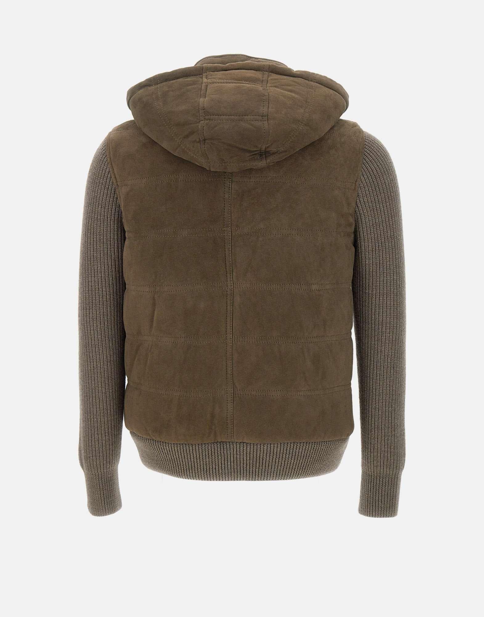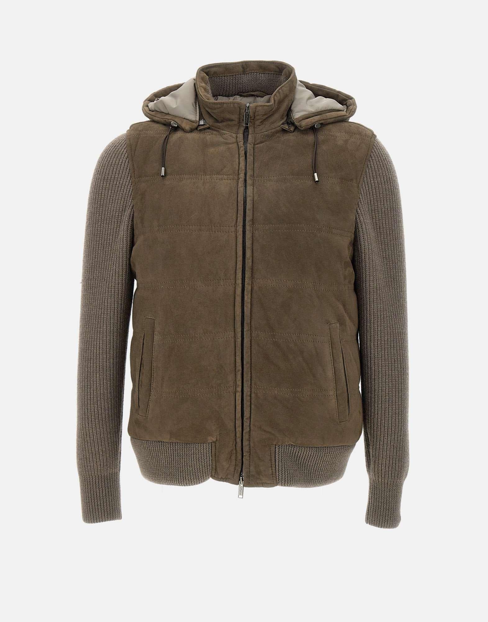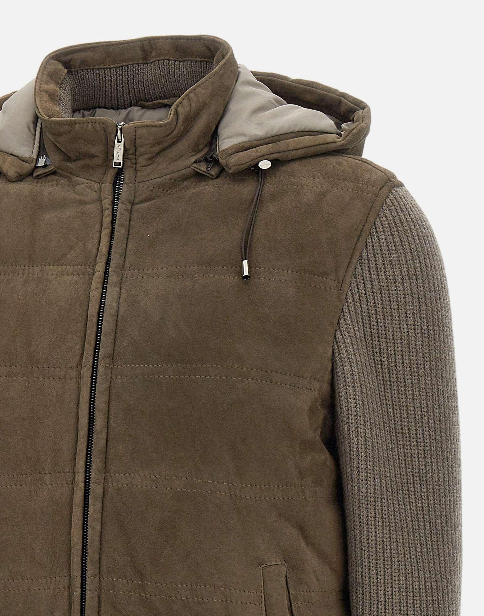 Giacca uomo Volfagli "Donizetti ", color fango, in pelle scamosciata, tecnologia Thermore che consente un isolamento termico ottimale, cappuccio removibile e dotato di coulisse, imbottita, maniche in maglia, chiusura con zip, tasche interne, tasche laterali a filo, made in Italy, regular fit, lavare solo presso centri specializzati.