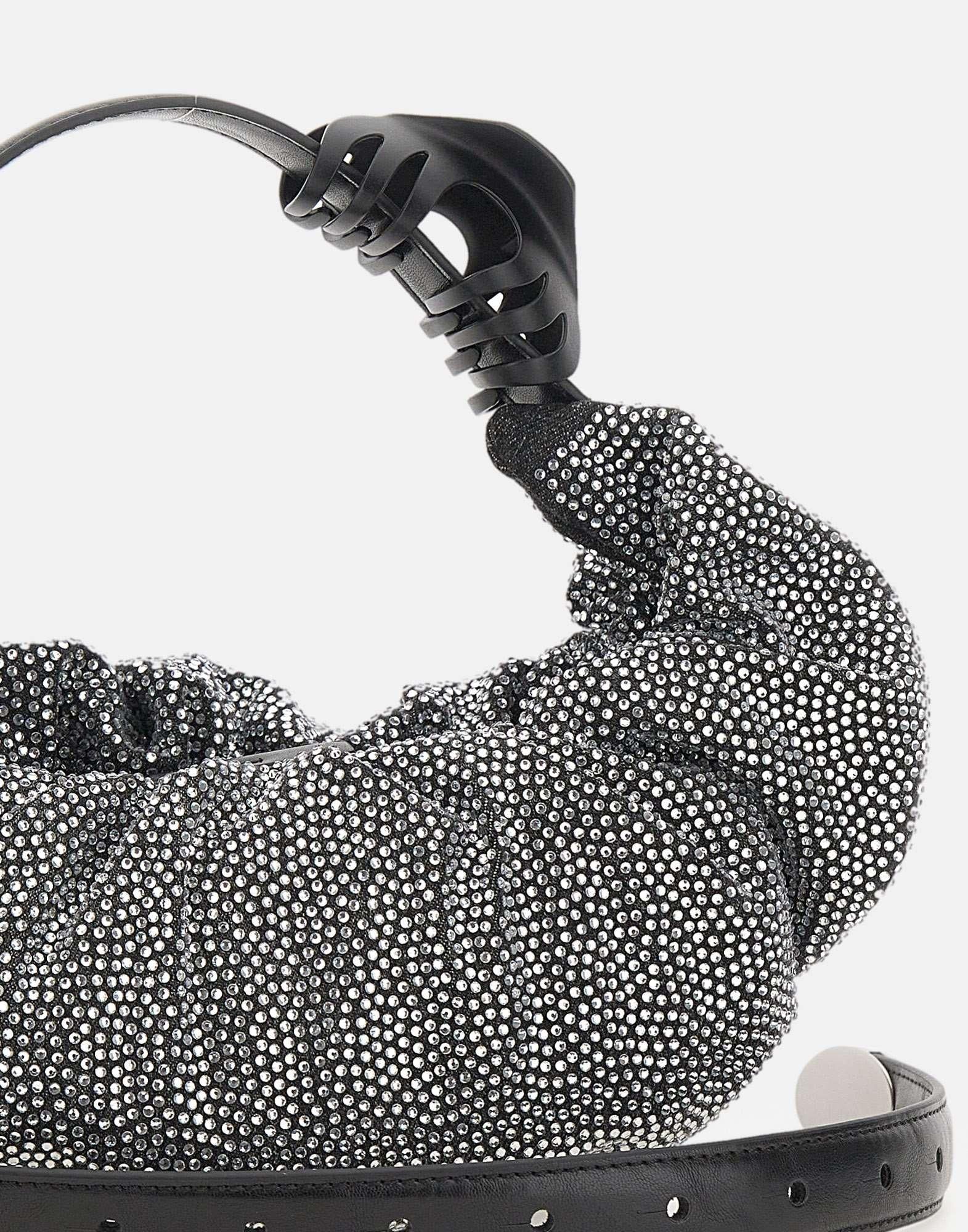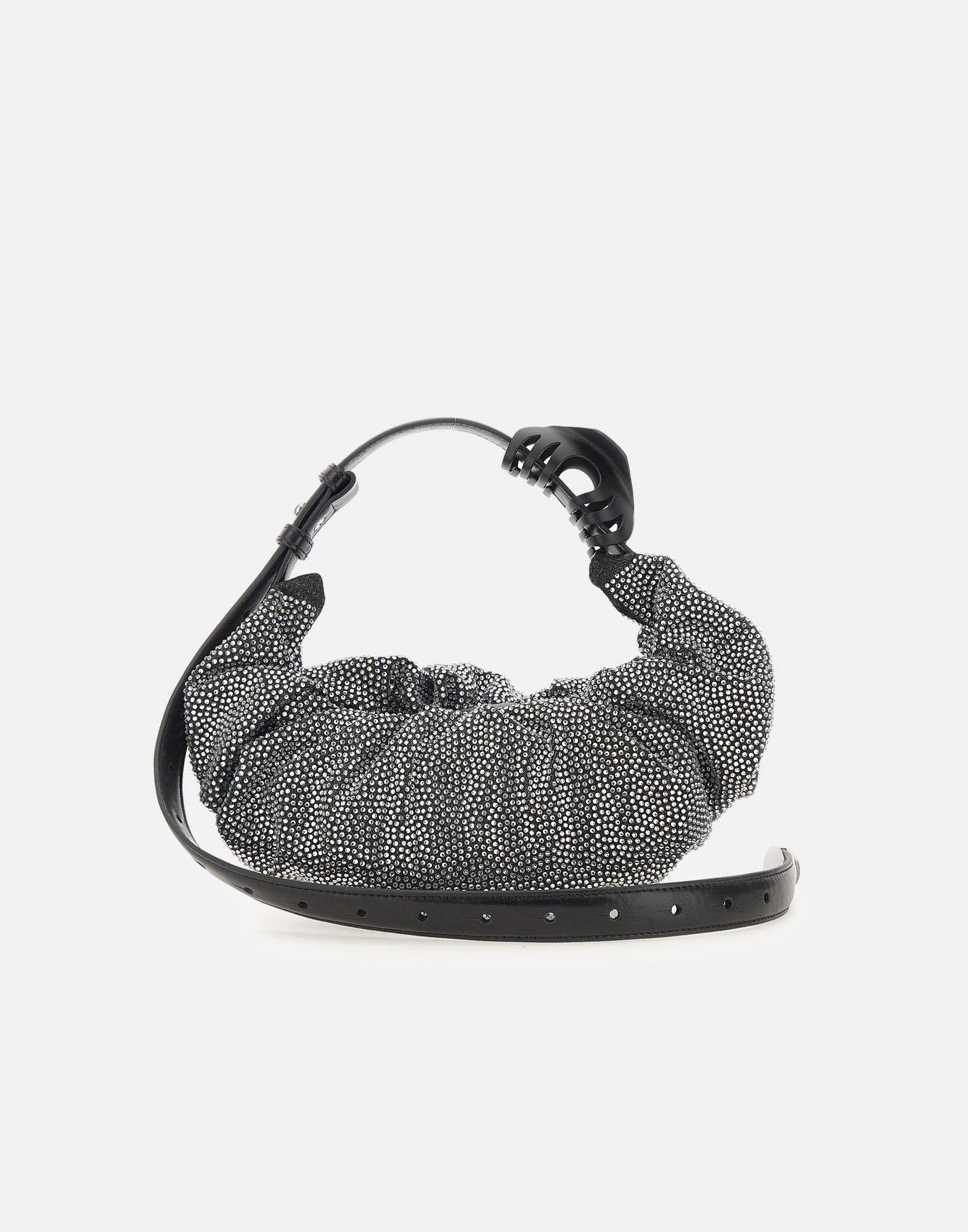 Borsa Diesel modello "Grab-D Hobo", caratterizzata da un design morbido e arricciato con silhouette ampia. Interamente rivestita di strass argento, è arricchita da dettagli in pelle e metalleria argentata. Presenta manico regolabile, chiusura superiore con zip e fermaglio per capelli coordinato. Dimensioni: 30 x 9 x 15 cm. Completa di custodia in tessuto originale.