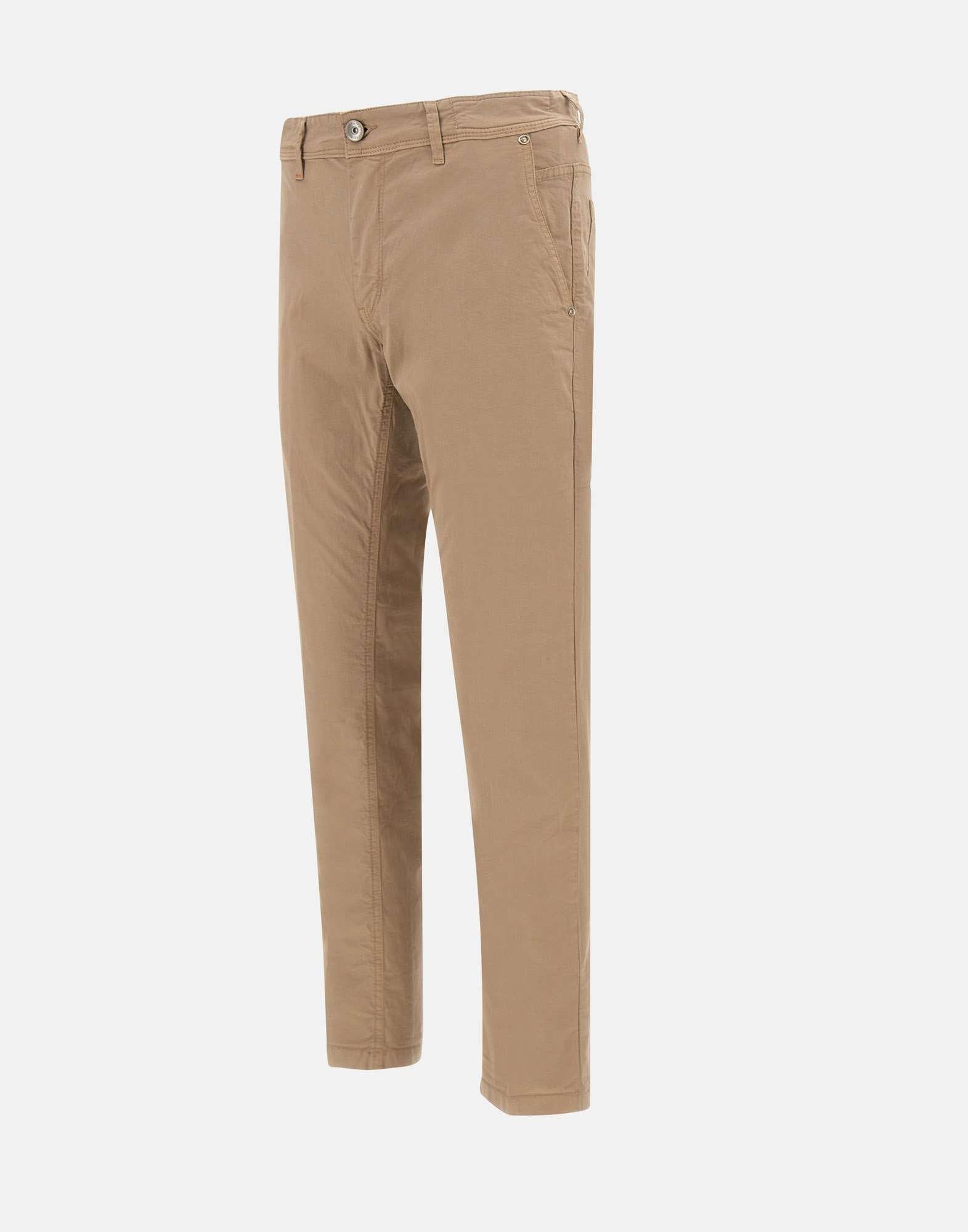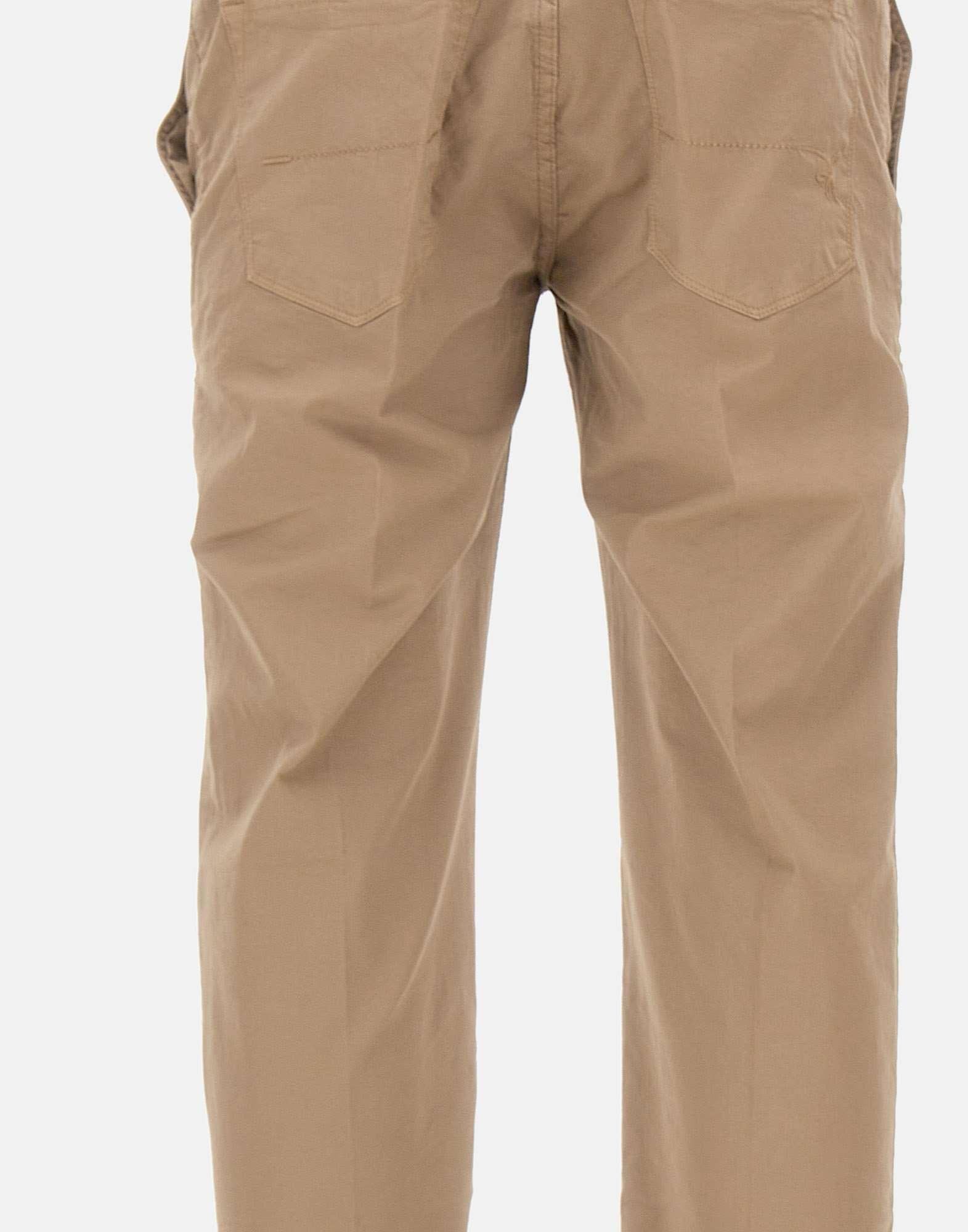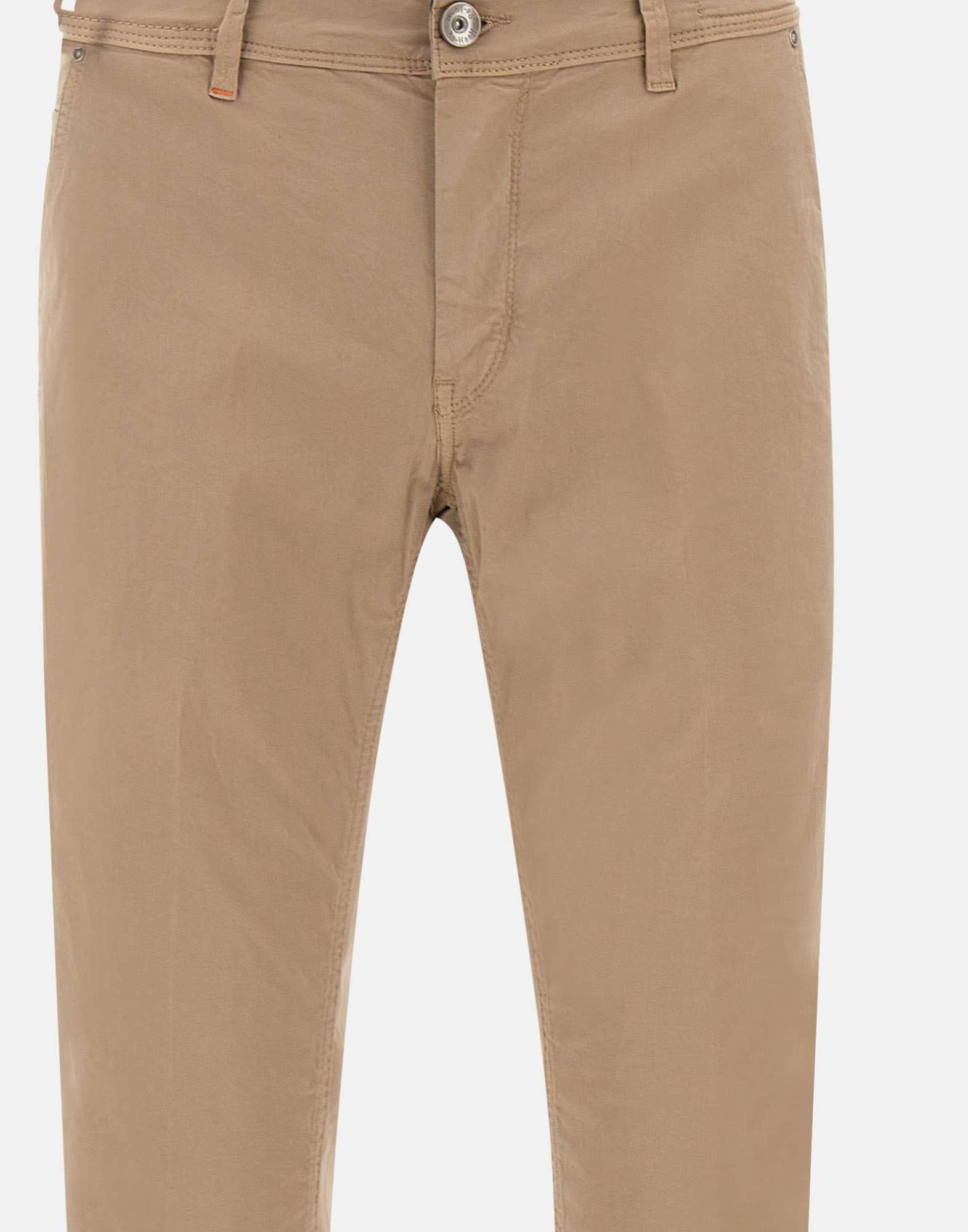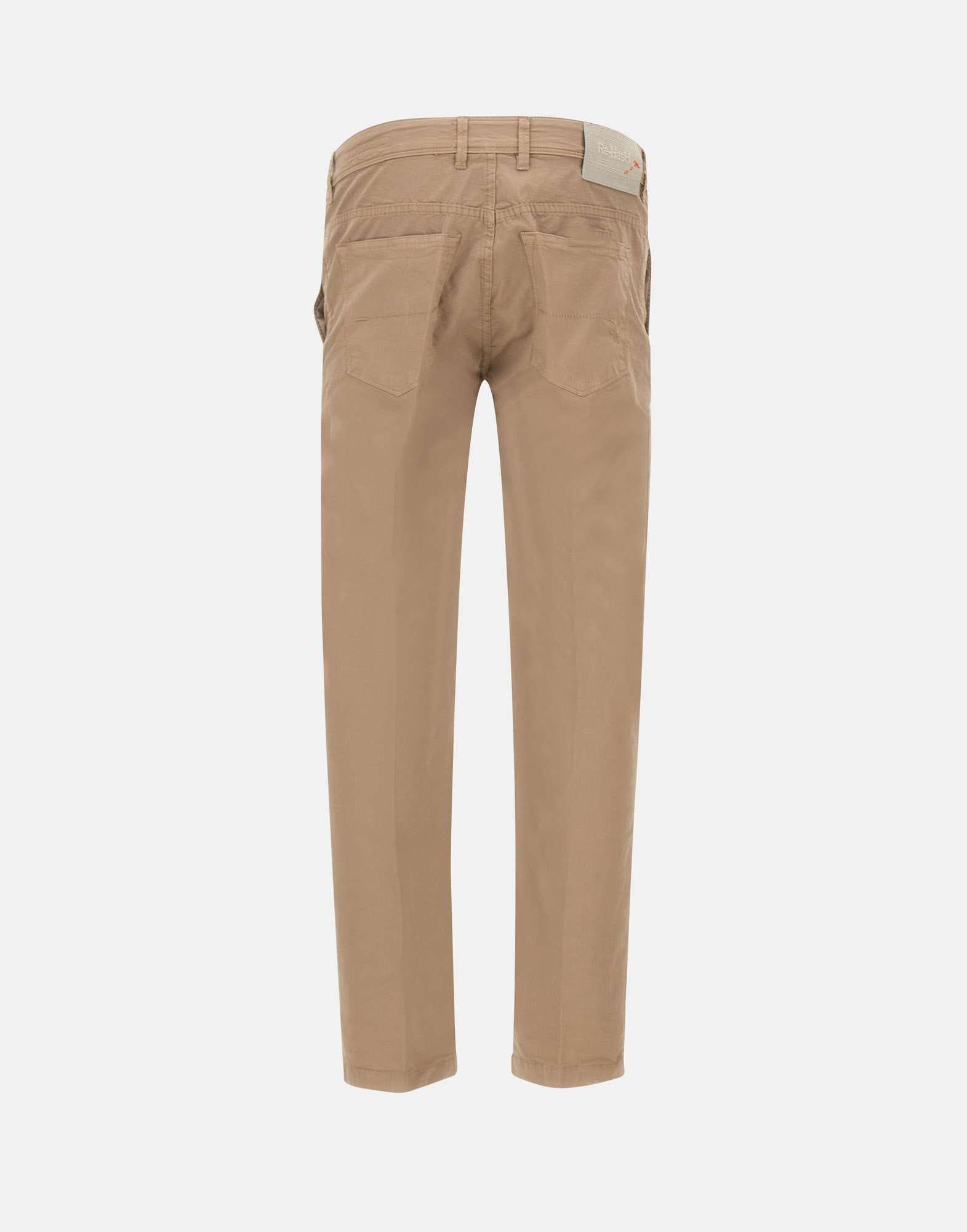 Pantaloni uomo Re-Hash "Mariotto" in cotone Pima stretch, caffelatte, Luxury Classic Edition, chiusura con zip e bottone logato, tessuto ultrafresco, vita regolare con passanti per cintura, cinque tasche, patch logo sul retro, slim fit. Made in Italy.